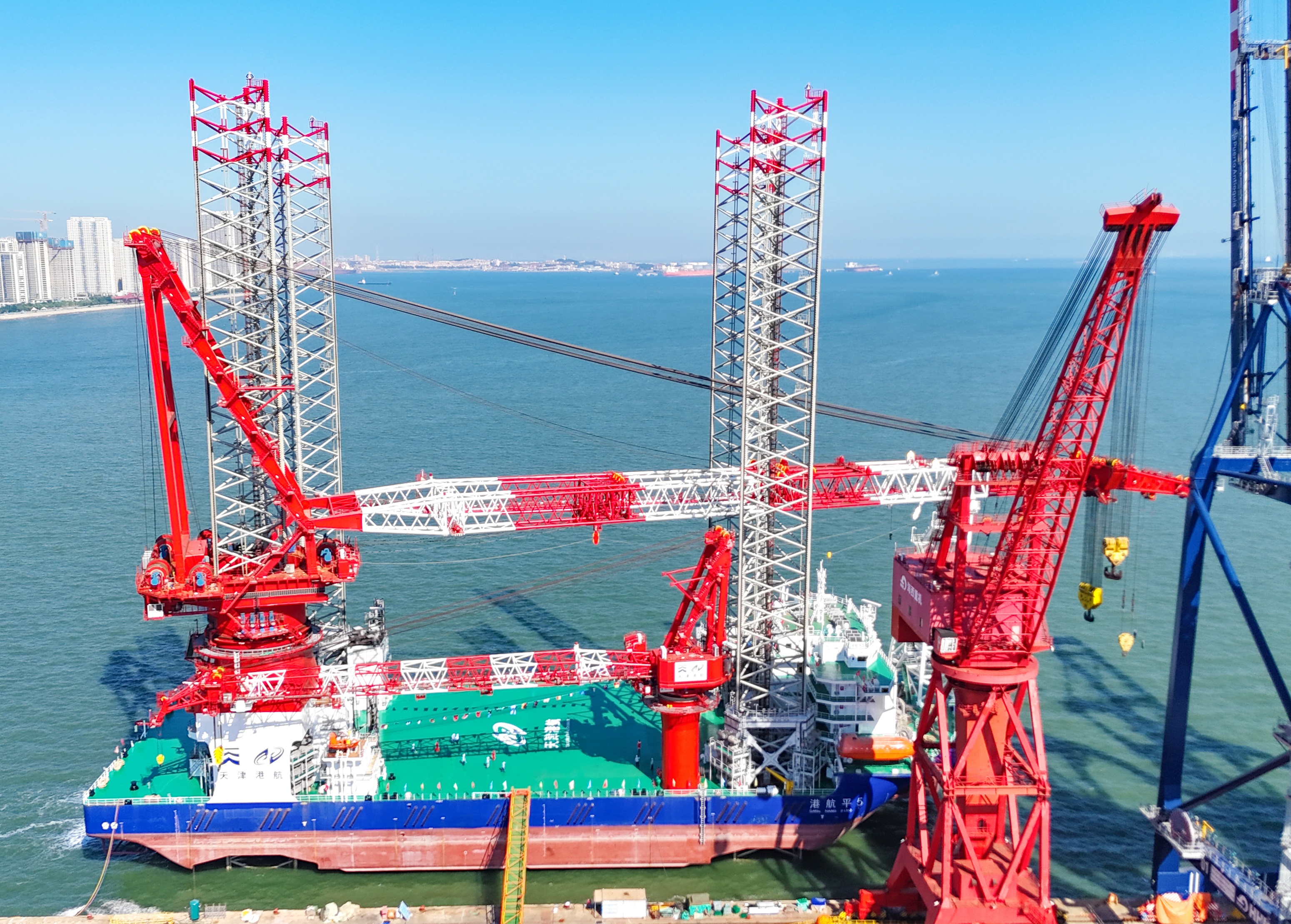 据了解,“港航平5”平台船长135米,宽50米,最大作业水深70米,最大起重能力1800吨,甲板面上起升高度168m,是目前国内起升高度最高的海上风电安装平台。正式投用后预计一年可安装海上风机100台以上。