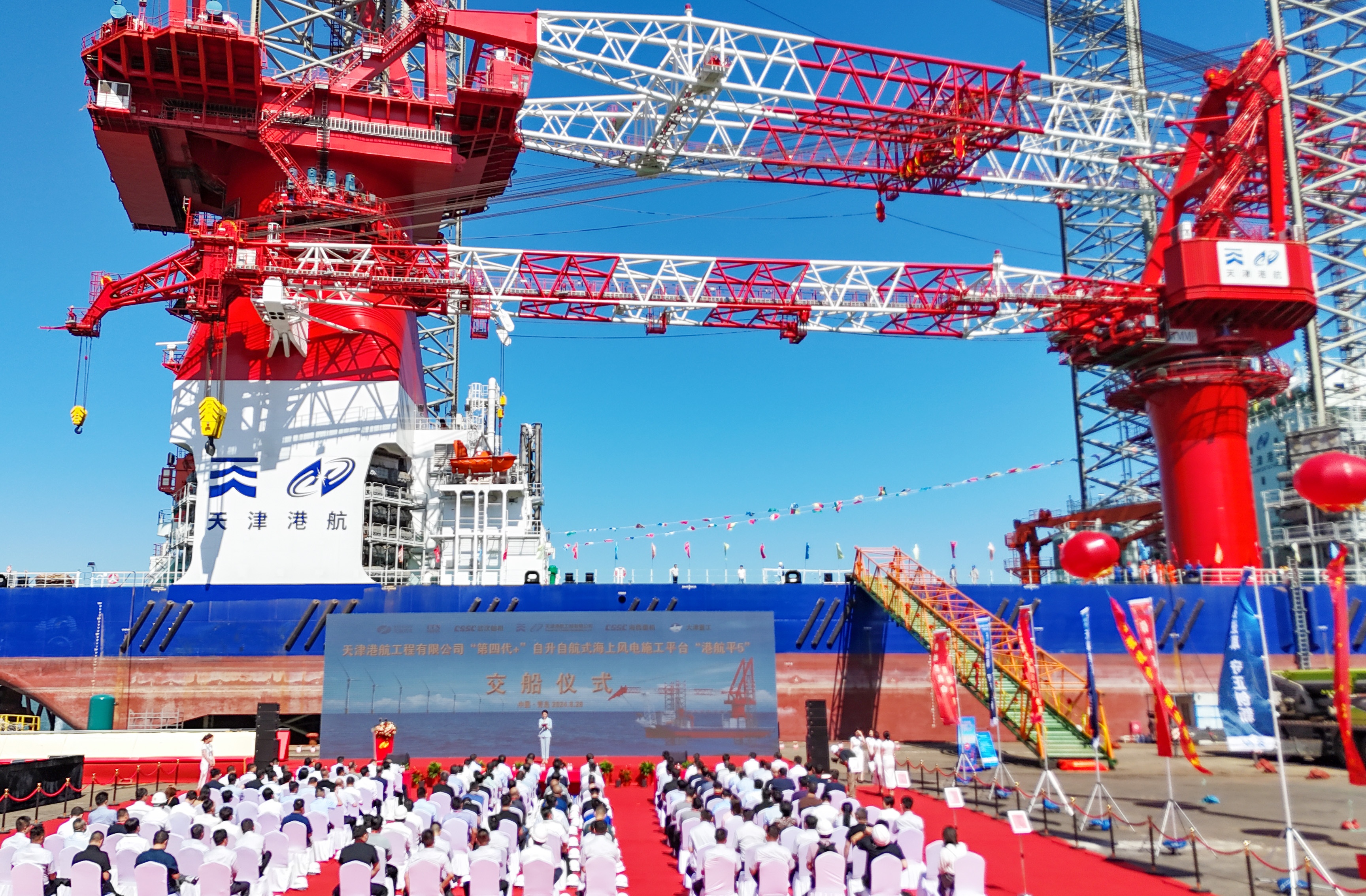 8月28日,位于青岛西海岸新区的青岛海西重机有限责任公司,国内首艘搭载智能船舶系统的自升自航式海上风电安装平台“港航平5”举行交船仪式,正式交付业主天津港航工程有限公司。