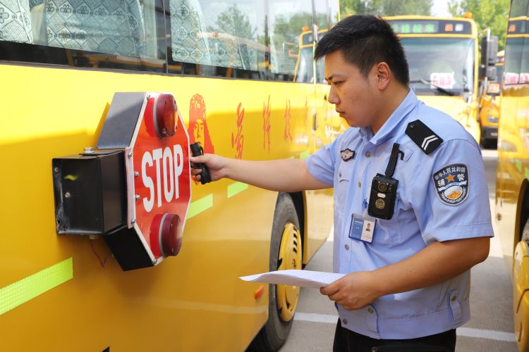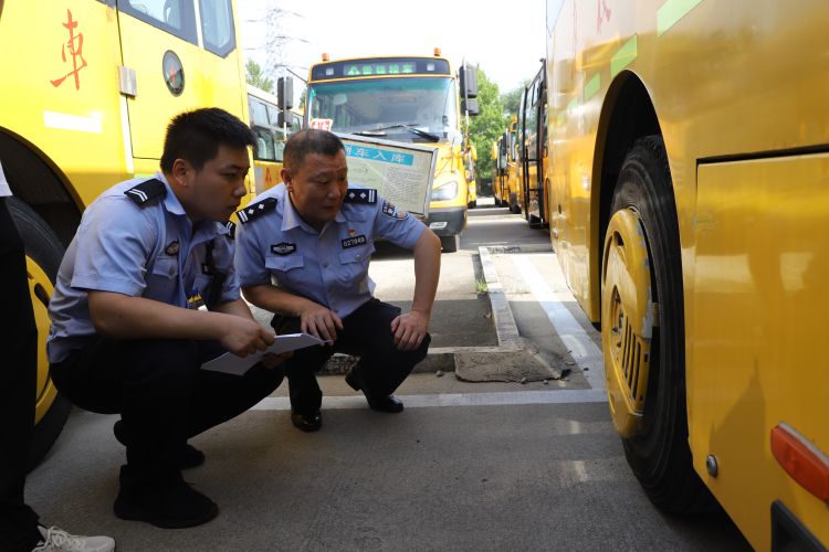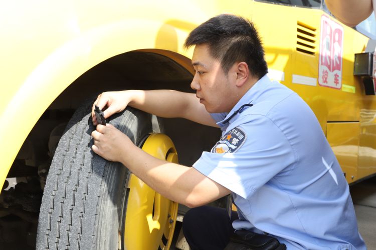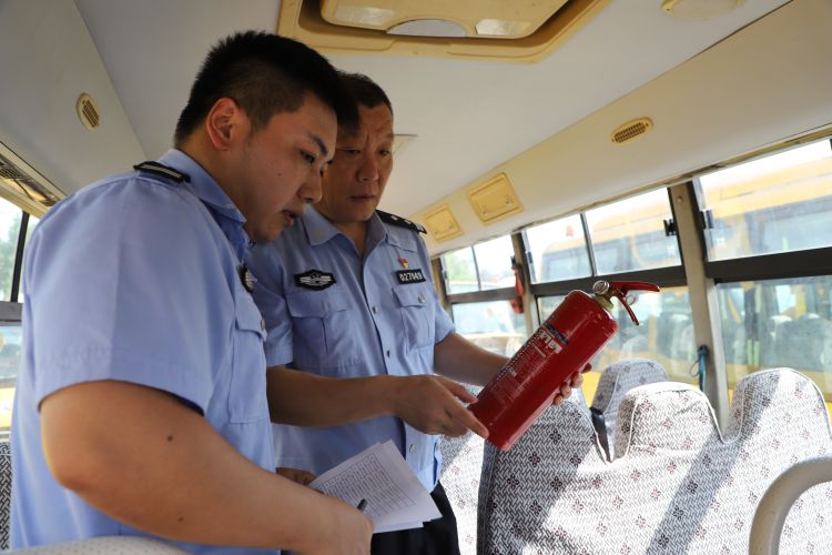 车管所查验民警对校车逐一检查,查看驾驶人相关资质,对校车配备的灭火器、急救箱、安全手锤、校车警示灯、安全带等重点项目进行检查,全力确保校车运营安全。