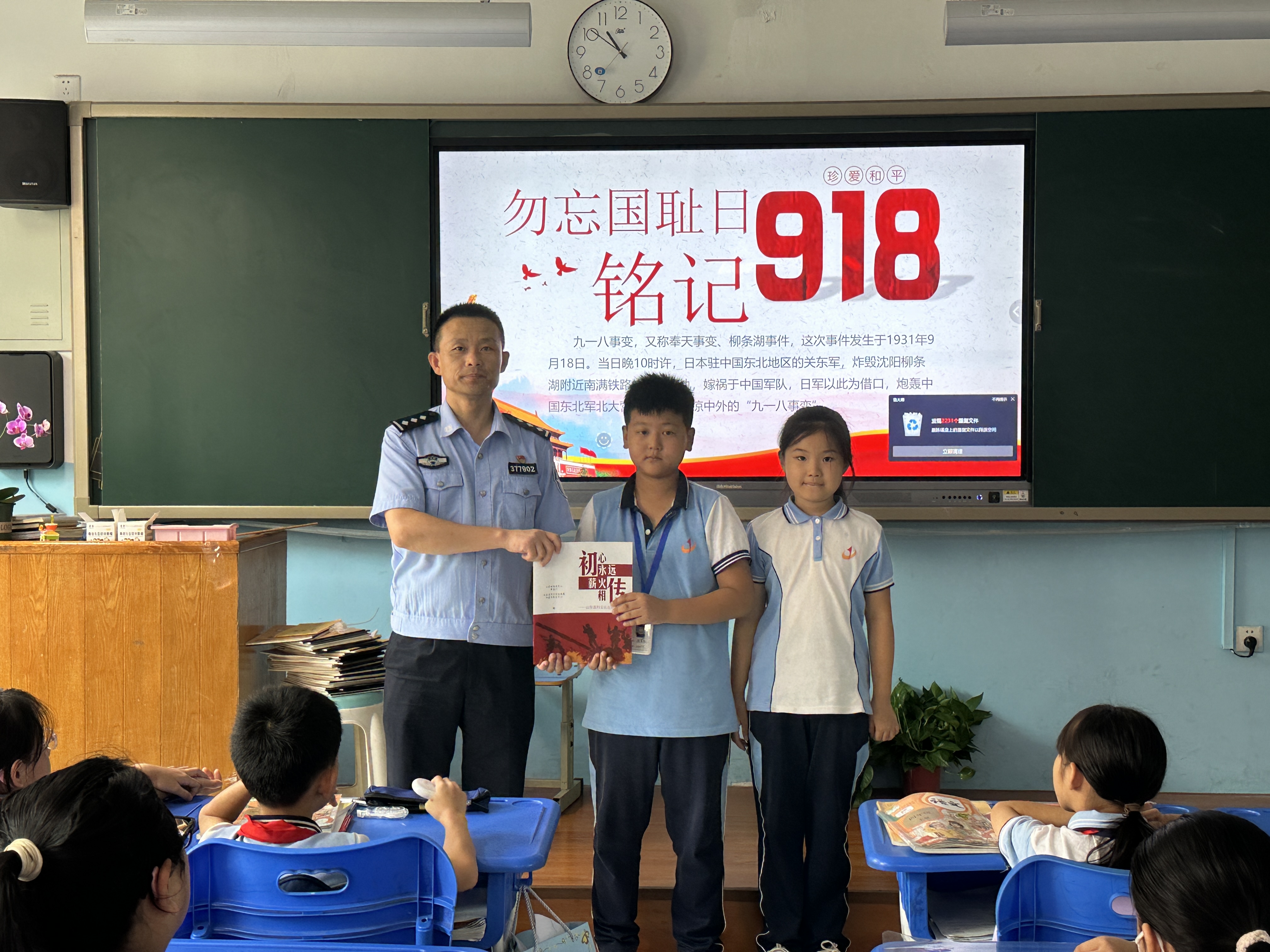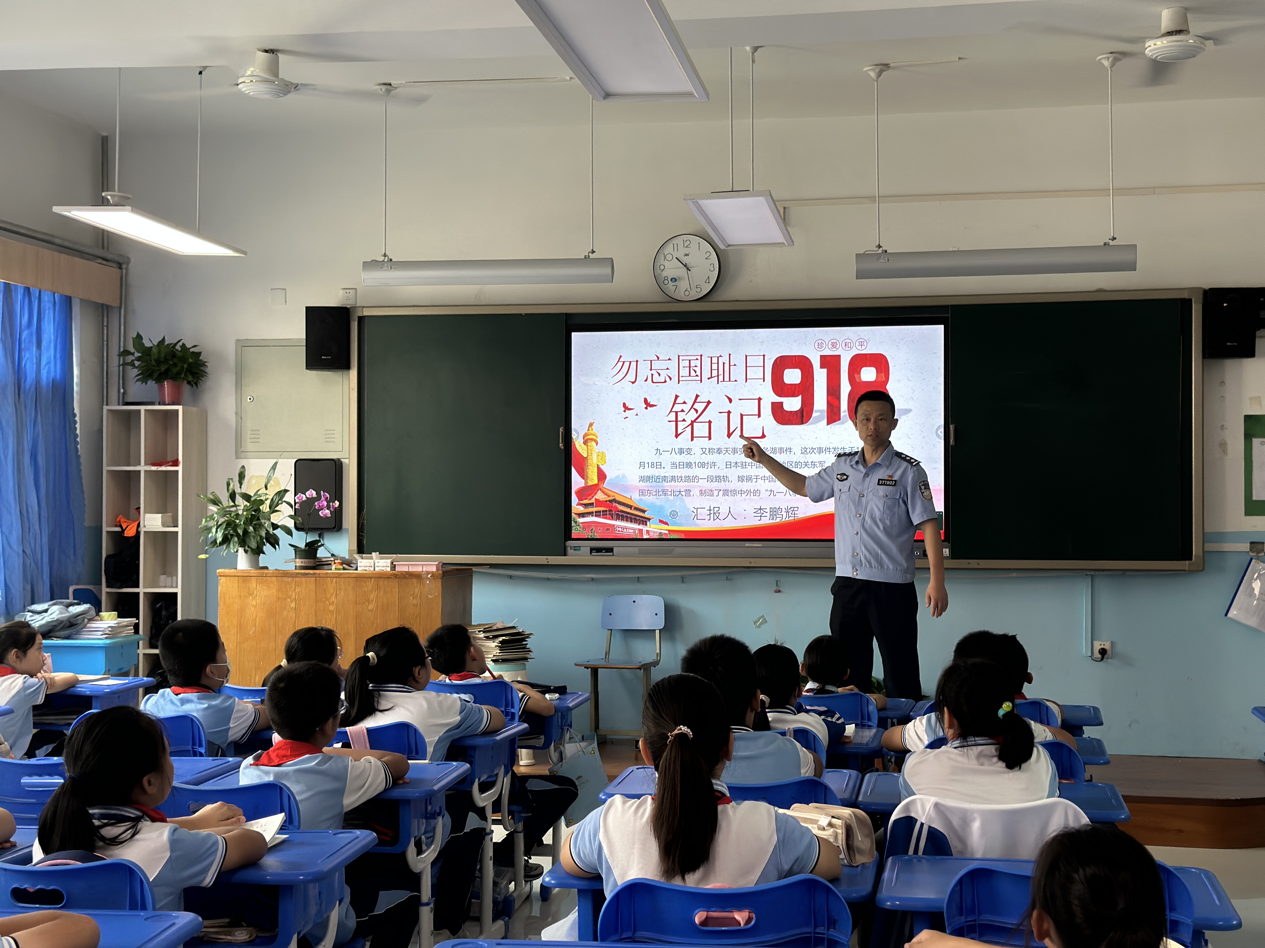 9月18日上午,在东营区一中四年级八班的教室里,气氛庄严肃穆。东营退役军人校外辅导员、东营区法院法警大队干警李鹏辉应师生之邀,正在为大家进行一堂意义深远的“勿忘国耻,铭记 9.18”的授课。