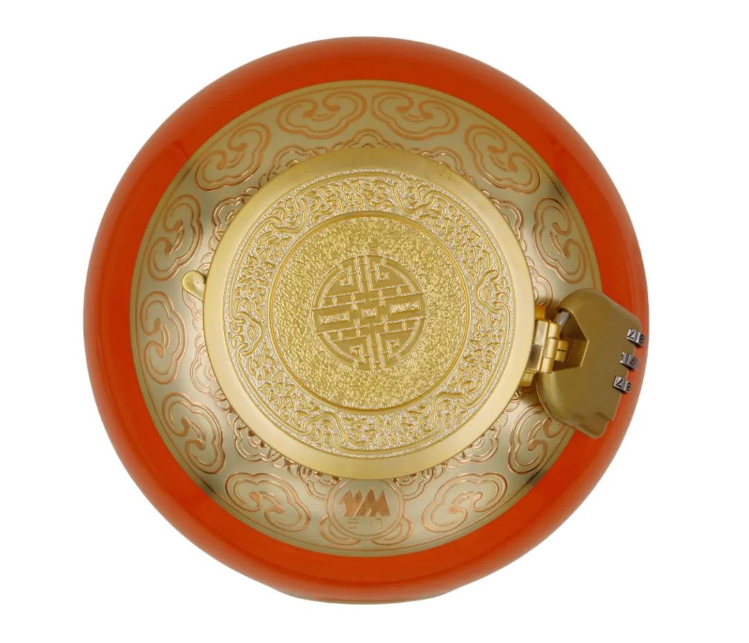 传统酒坛古典韵味,坛身线条流畅、造型饱满;色彩上大胆创新,选用温暖且充满活力的橙色,点亮视觉感官,犹如晨曦初露的灿烂阳光,璀璨夺目,象征着新时代的勃勃生机与无限希望!