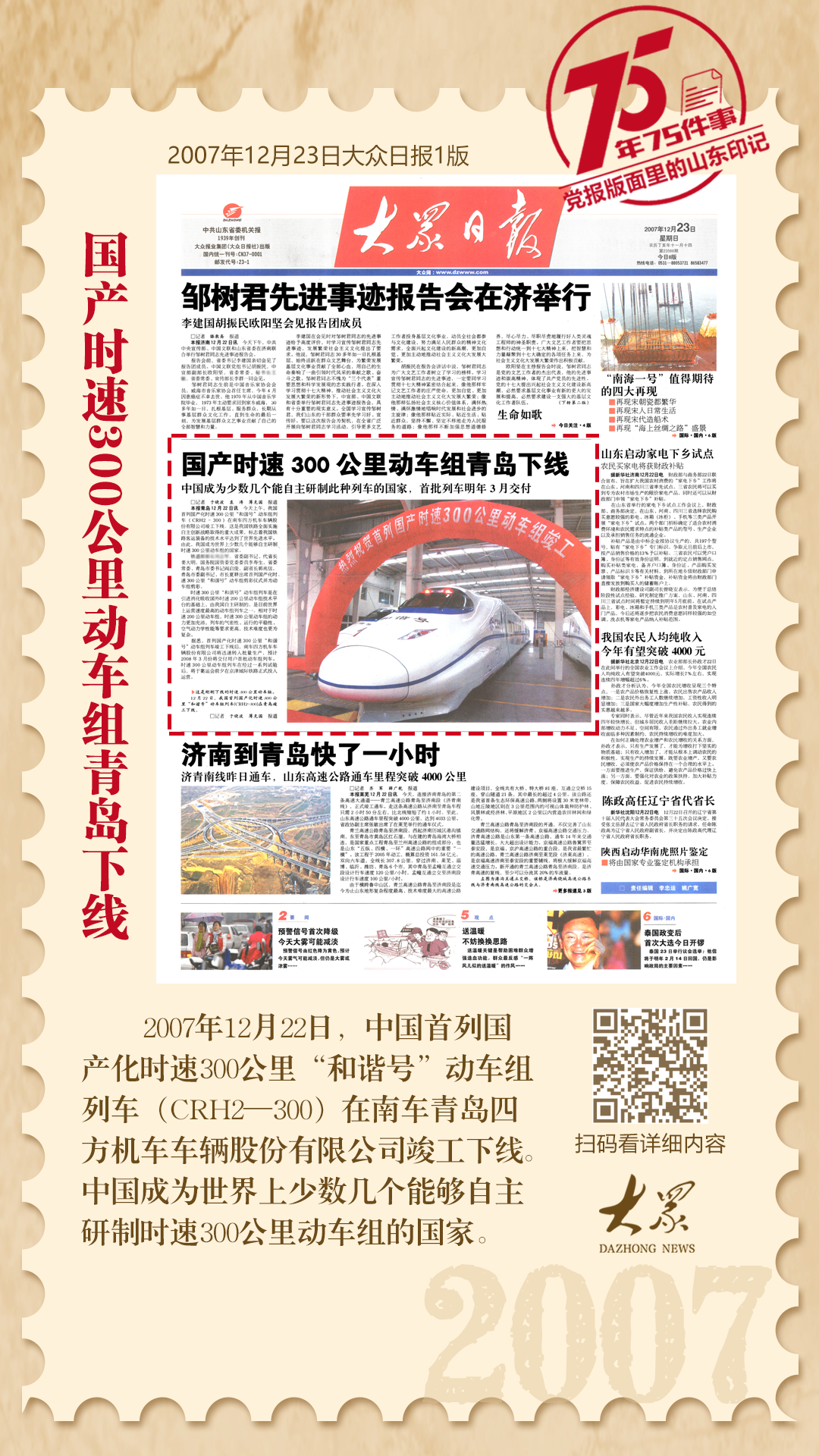 2007年12月22日,中国首列国产化时速300公里“和谐号”动车组列车(CRH2—300)在南车青岛四方机车车辆股份有限公司竣工下线。中国成为世界上少数几个能够自主研制时速300公里动车组的国家。2007年12月23日大众日报1版刊发《国产时速300公里动车组青岛下线》对此进行报道,摘录如下: