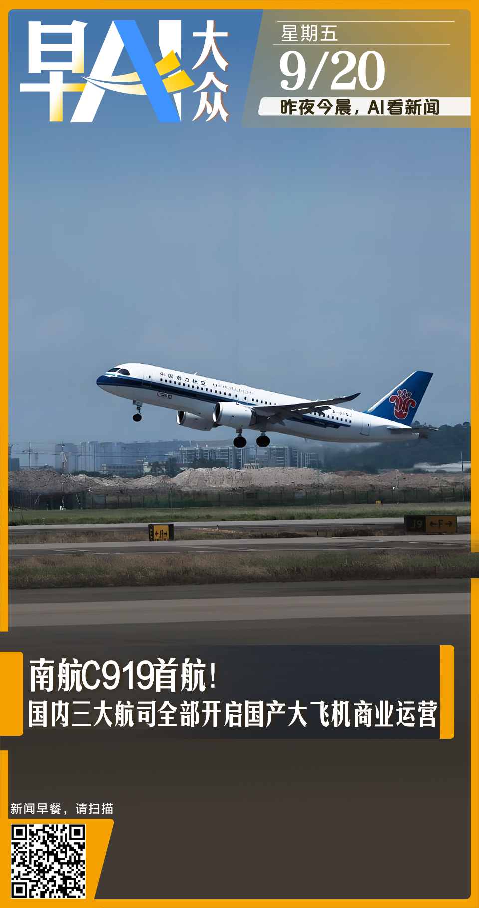 9月19日下午,南航CZ3539航班从广州飞抵上海,这是交付南航的国产大飞机C919的商业首航。至此,国航、东航、南航均已将C919投入商业运营,标志其规模化运营迈入新阶段。详情>>