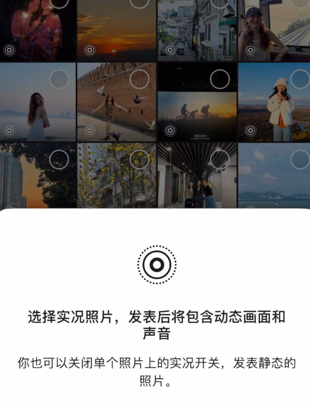 打开朋友圈-从手机相册选择,即可选中并发布实况照片,照片将包含动态画面和声音。发布时,也可以点击关闭实况效果,支持静态照片与实况照片混合发布。详情>>