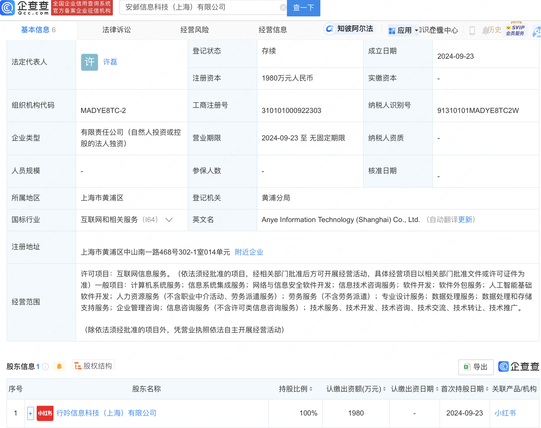 企查查APP显示,近日,安邺信息科技(上海)有限公司成立,法定代表人为许磊,注册资本1980万人民币,经营范围含计算机系统服务、信息系统集成服务、网络与信息安全软件开发、人工智能基础软件开发等。企查查股权穿透显示,该公司由小红书关联公司行吟信息科技(上海)有限公司全资持股,创始人毛文超为实控人。(企查查)