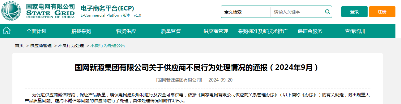 9月20日,国网新源集团有限公司发布了供应商不良行为处理情况的通报(2024年9月),对出现重大产品质量问题、履约不诚信等问题的供应商进行了处理。其中,中国兵器装备集团旗下的湖南云箭集团有限公司上榜。