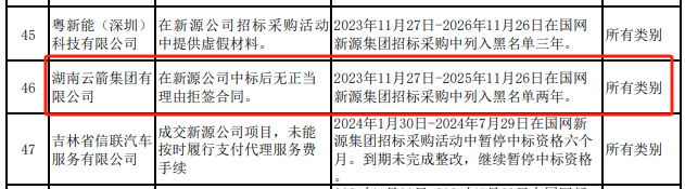 据国网新源集团公告的不良行为描述显示:湖南云箭集团在新源公司中标后无正当理由拒签合同。处理措施为:2023年11月27日—2025年11月26日在国网新源集团招标采购中列入黑名单两年。处理范围为:所有类别。