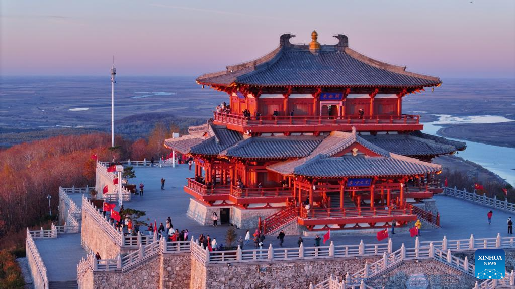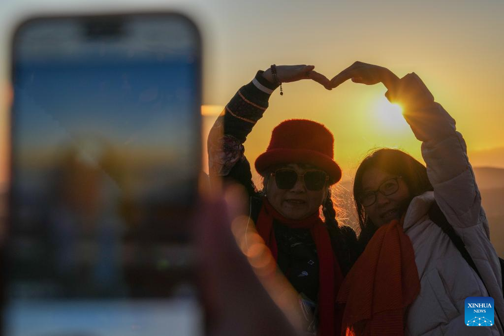 Tourists pose for photos with the rising sun in Fuyuan City, northeast China's Heilongjiang Province, Oct. 12, 2024. Fuyuan City, a famous tourist attraction, has attracted over 2.1 million visitors from January to September this year. (Xinhua/Wang Jianwei)