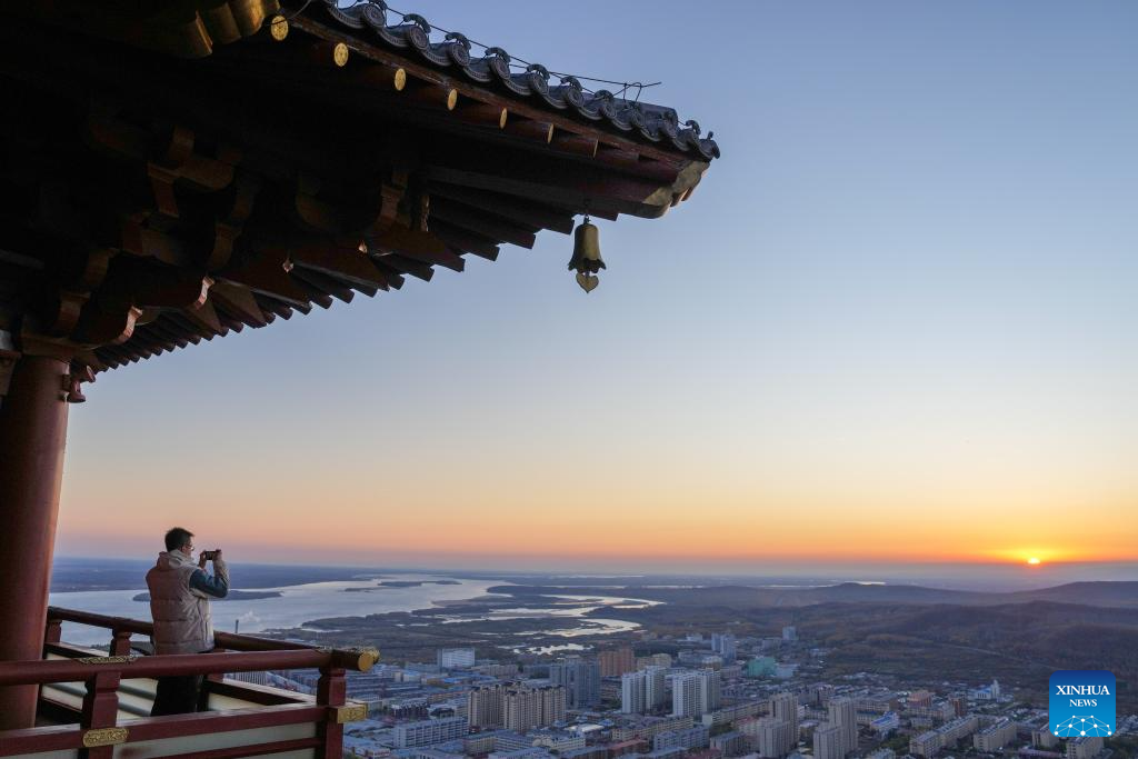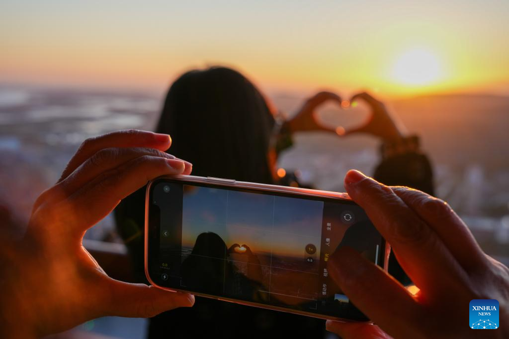 A tourist takes photos of the rising sun in Fuyuan City, northeast China's Heilongjiang Province, Oct. 12, 2024. Fuyuan City, a famous tourist attraction, has attracted over 2.1 million visitors from January to September this year. (Xinhua/Wang Jianwei)