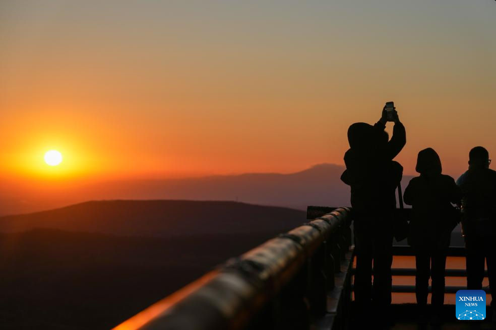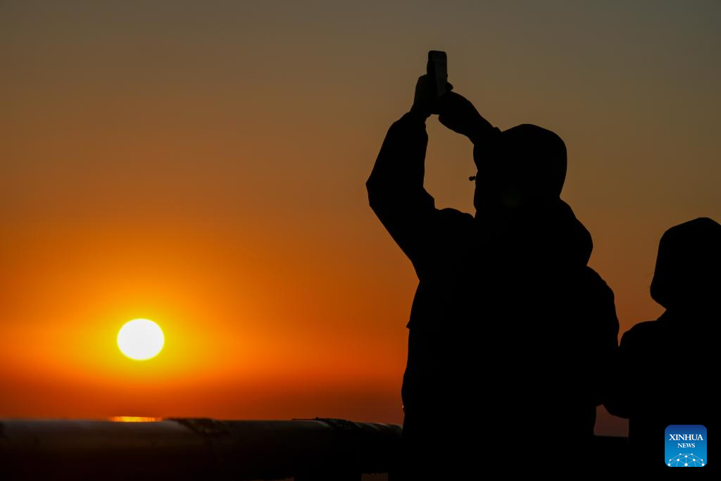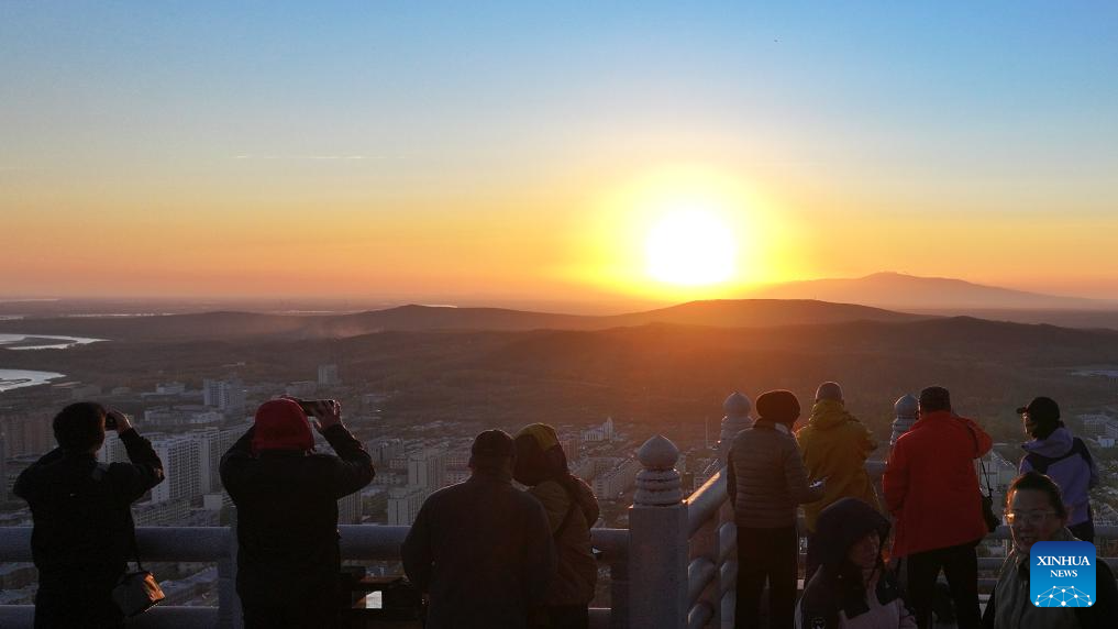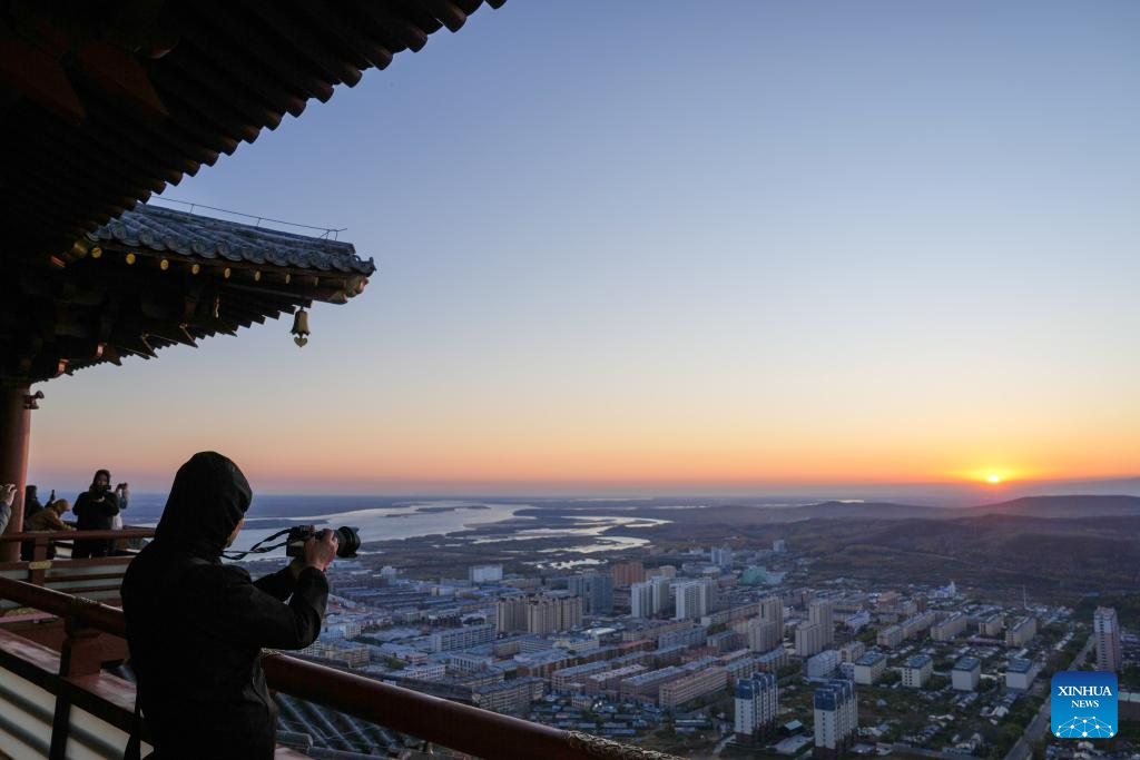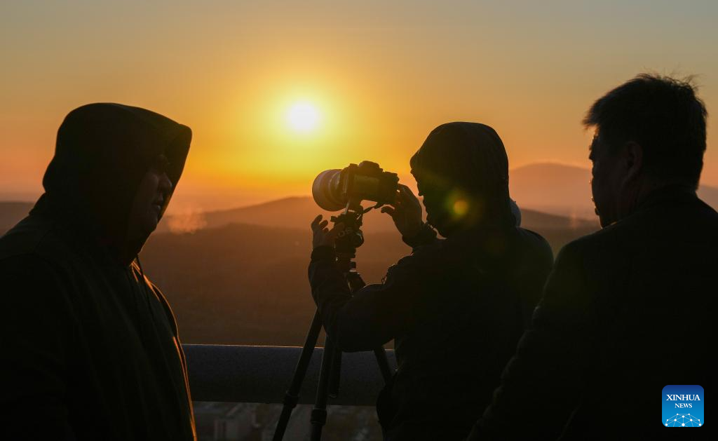 Tourists take photos of the rising sun in Fuyuan City, northeast China's Heilongjiang Province, Oct. 12, 2024. Fuyuan City, a famous tourist attraction, has attracted over 2.1 million visitors from January to September this year. (Xinhua/Wang Jianwei)