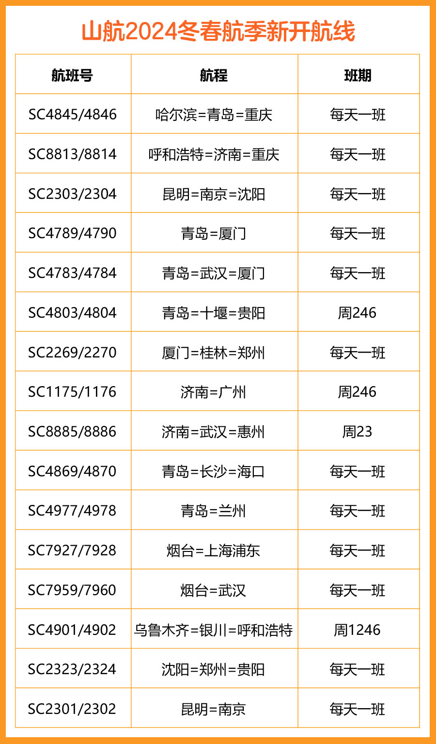 新开哈尔滨=青岛=重庆航线,航班号SC4845/4846,每天一班;新开呼和浩特=济南=重庆航线,航班号SC8813/8814,每天一班;新开昆明=南京=沈阳航线,航班号SC2303/2304,每天一班;新开青岛=厦门航线,航班号SC4789/4790,每天一班;新开青岛=武汉=厦门航线,航班号SC4783/4784,每天一班。