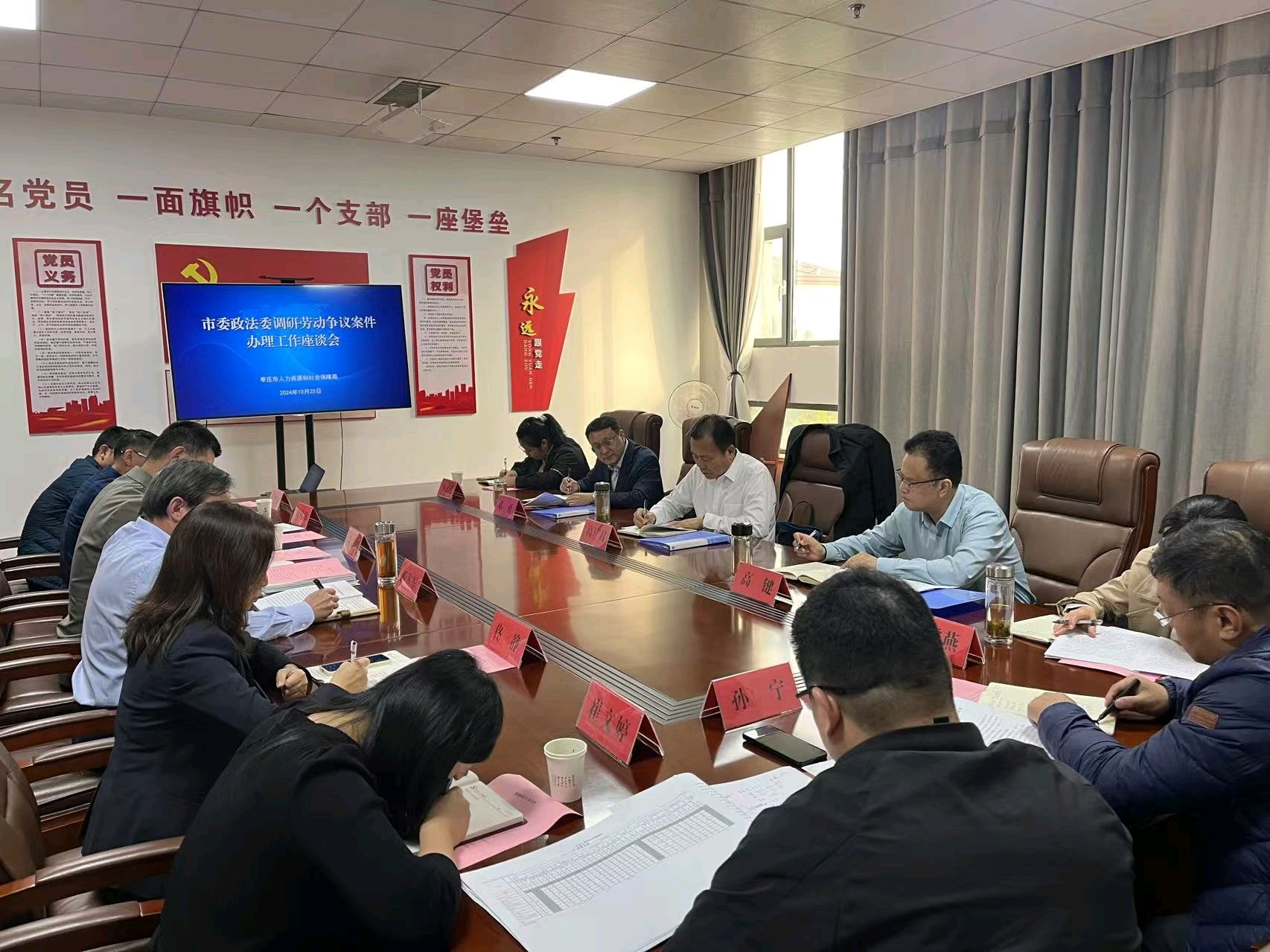 10月25日,枣庄市委政法委副书记高广君率市委政法委、市中级人民法院一行5人到市人社局开展劳动争议仲裁案件办理工作专题调研,并进行座谈交流。市人社局分管负责同志、市劳动人事争议仲裁院相关负责同志及工作人员陪同调研。
