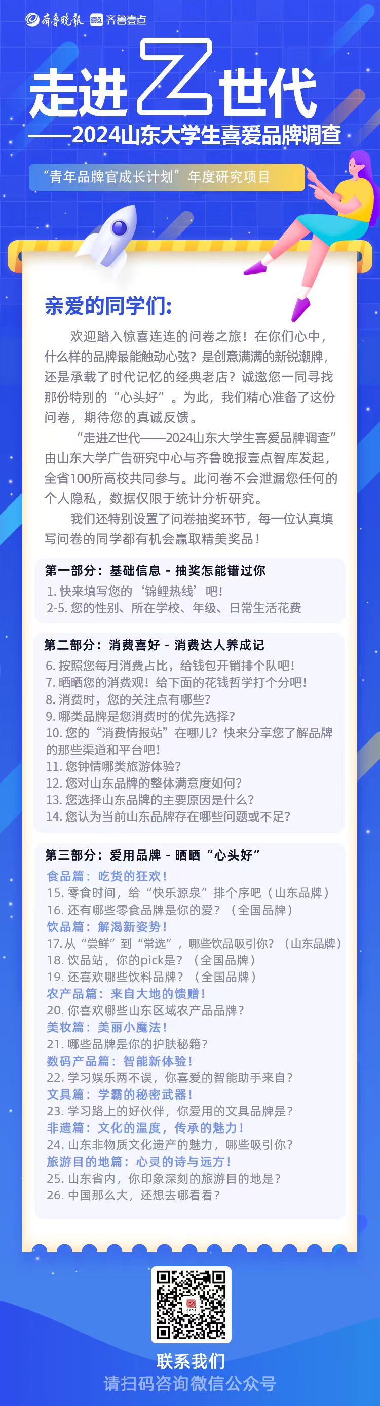 参与方式:公众扫描二维码,进入“走进Z世代——2024山东大学生喜爱品牌调查”活动界面后,根据提示填写个人基本资料,即可参与。有你的意见和态度,品牌调查才更有价值!完成问卷不仅可抽取现金红包,还有机会赢取携程精美大奖。