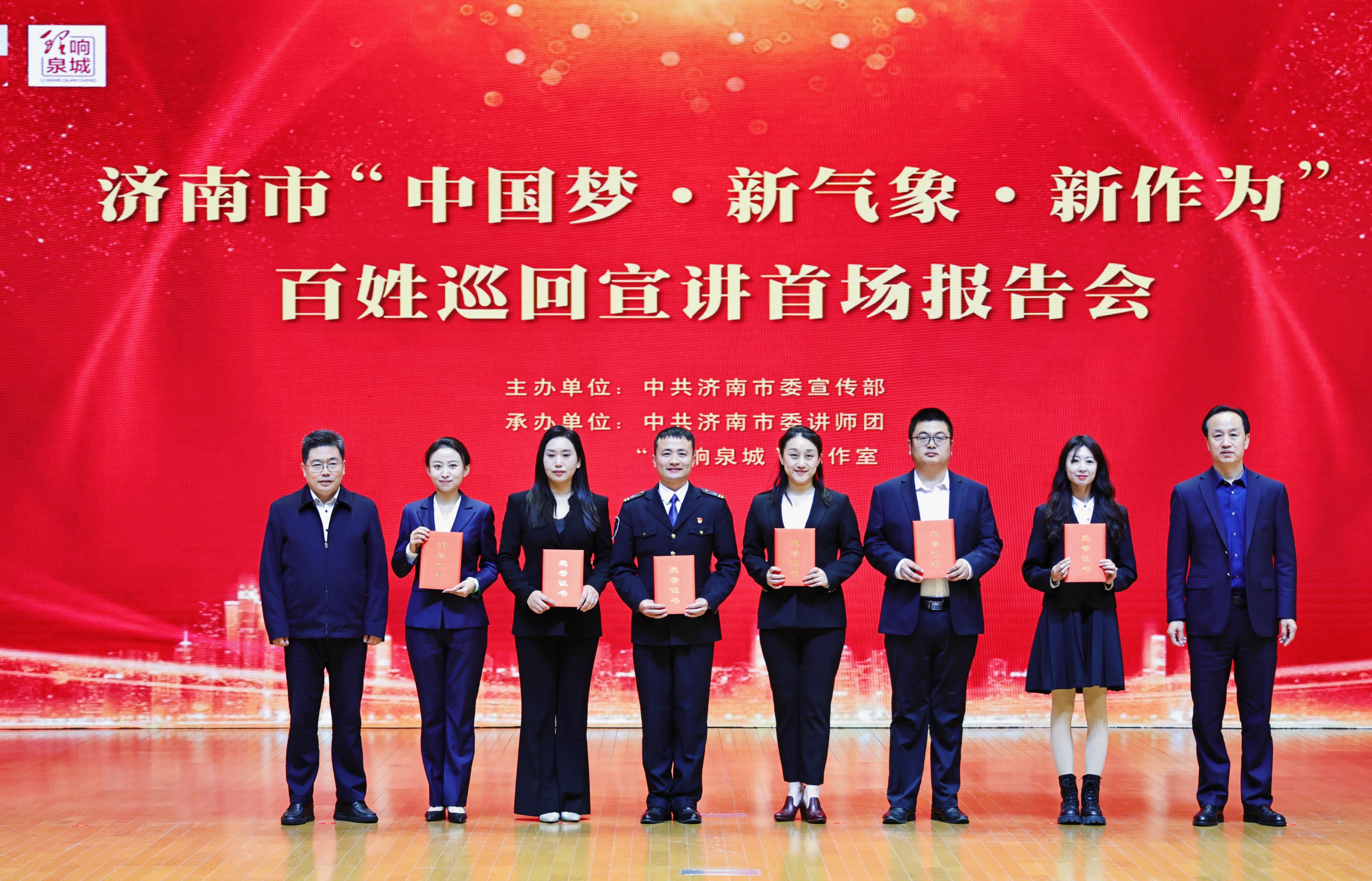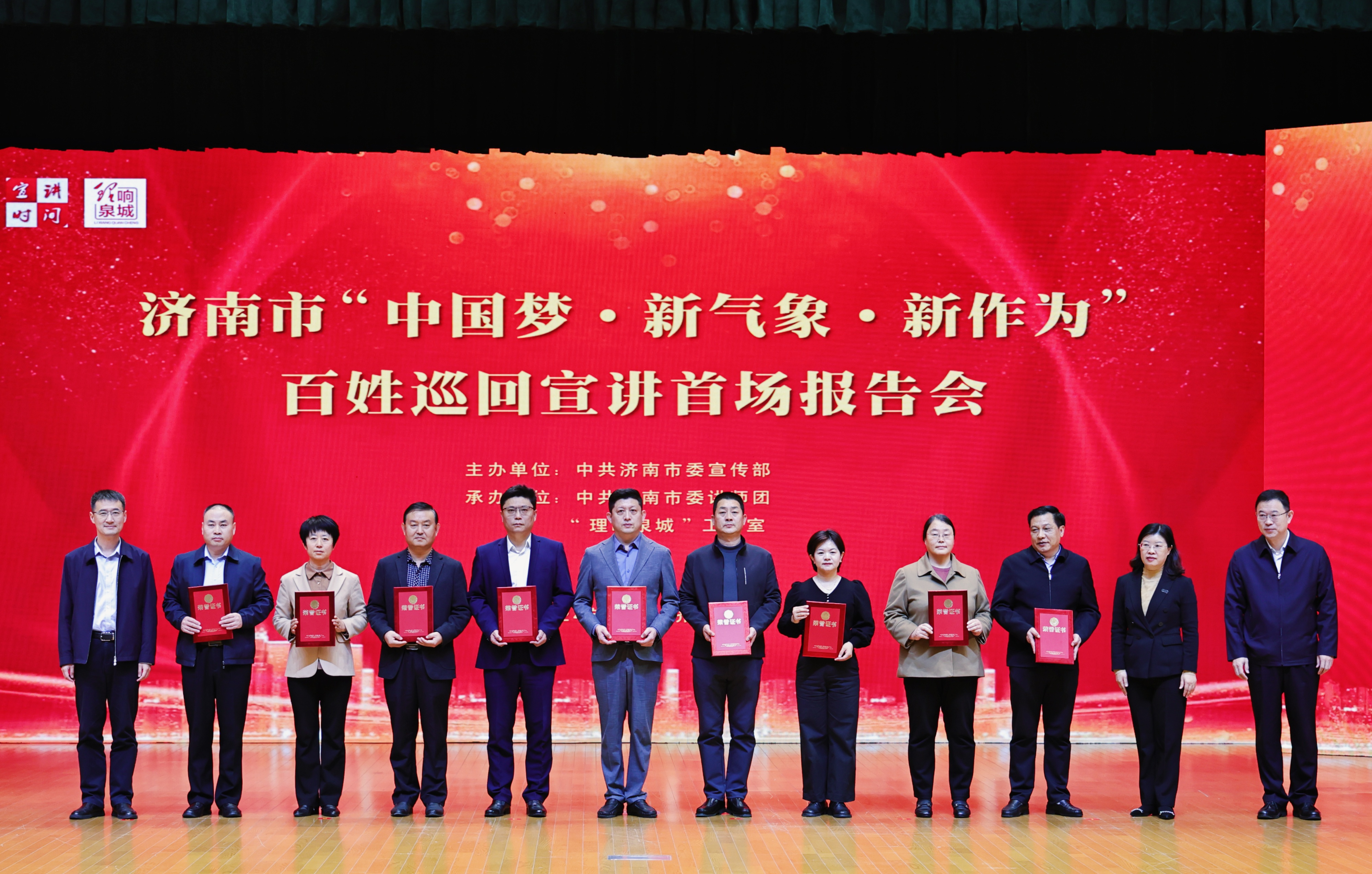 活动现场,通过专题汇报片回顾了2024年以来济南市理论宣讲工作情况,与会领导为“中国梦·新气象·新作为”百姓宣讲比赛获奖单位及个人代表颁奖,为“中国梦·新气象·新作为”百姓巡回宣讲团授旗,7位来自不同战线和岗位的宣讲员进行了首场宣讲。