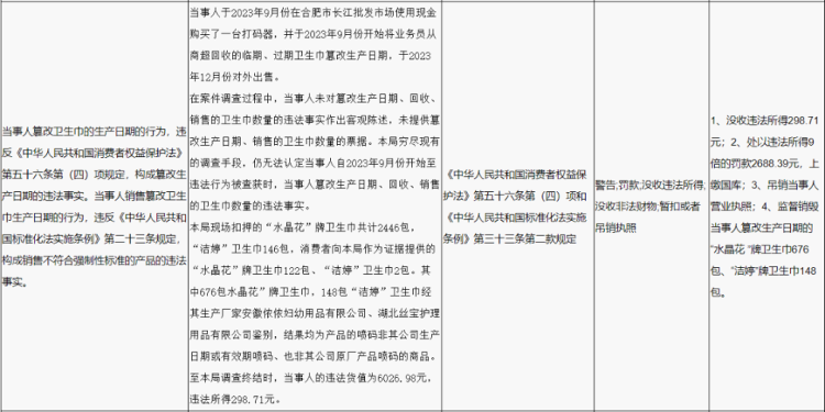 此外舒城锦鸿被吊销营业执照,监督销毁舒城锦鸿篡改生产日期的“水晶花 ”牌卫生巾676包、“洁婷”牌卫生巾148包。