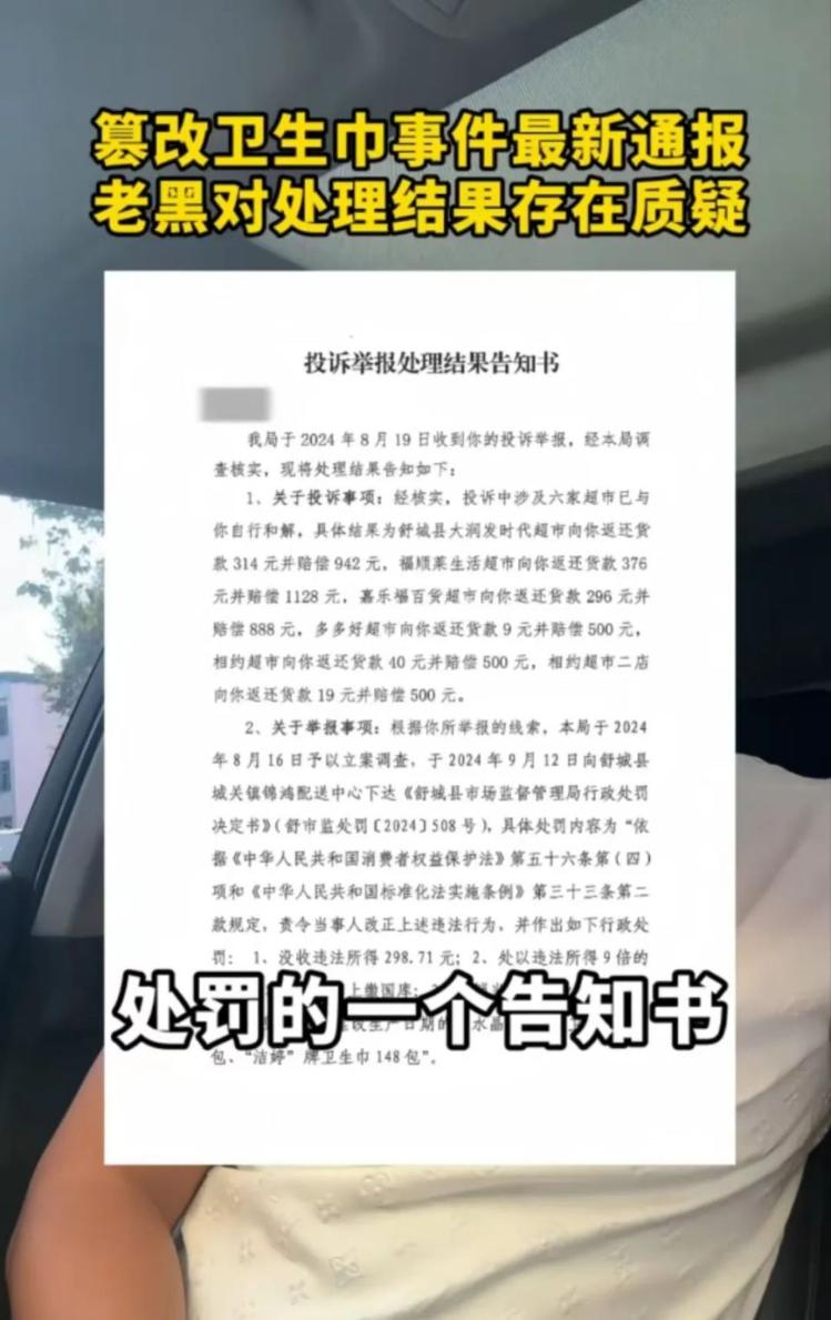 10月29日,博主“老黑”发布视频称自己收到了有关舒城县卫生巾篡改生产日期的投诉举报处理结果告知书(下称“告知书”)。
