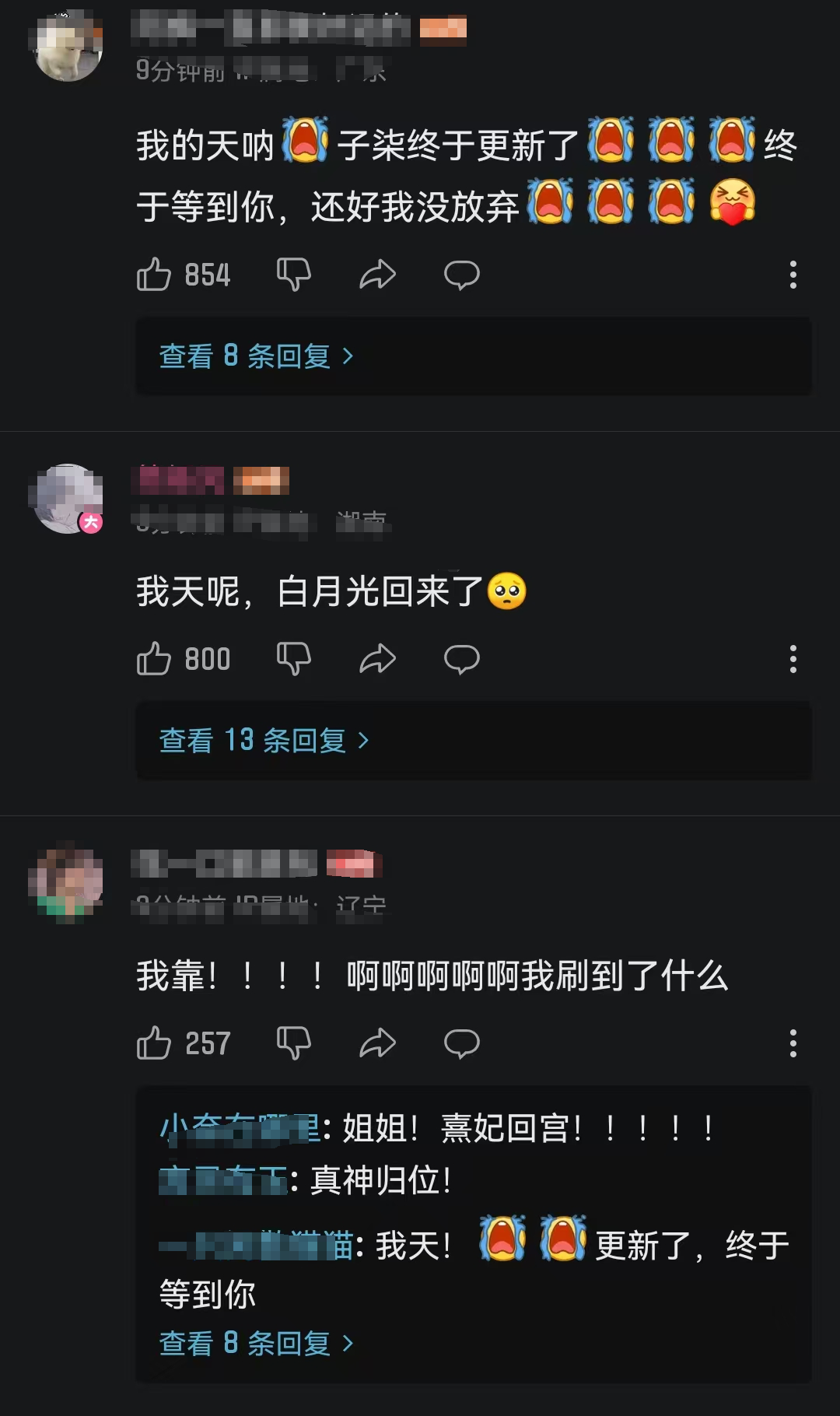 11月12日,李子柒在各平台更新视频。李子柒上一次更新作品是2021年7月14日,已经是1217天以前。“李子柒回归”词条也登上热搜第一。李子柒说:“这个大漆视频迟到了四年,‘漆’同‘柒’,我给这幅雕漆隐花的漆器作品取名‘紫气东来’麒麟回首,万事不愁,也把这份祝愿送给看到视频的每一个你,很想你们!”对此,网友纷纷评论“熹妃回宫了” “白月光回归”“终于等到你”……