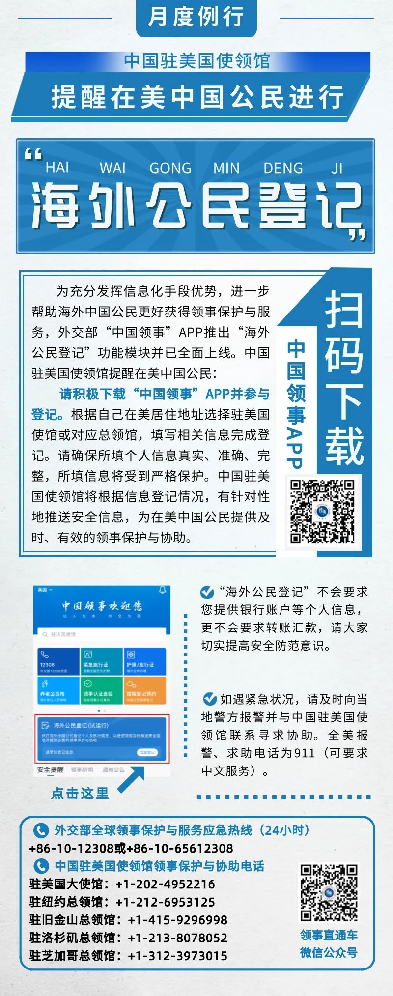 我驻美使馆提醒在美中国公民进行“海外公民登记”