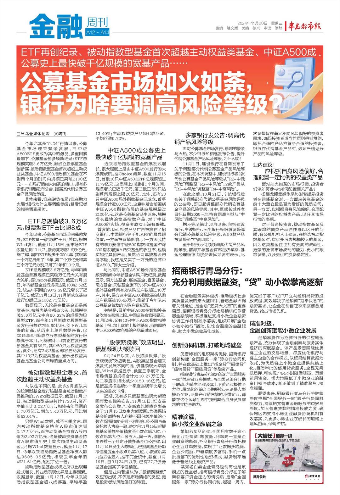 今年尤其是“9.24”行情以来,公募基金市场迎来繁荣发展,而中证A500ETF更成为其中的爆品,多重因素叠加下,公募基金创多项新纪录:ETF总规模突破3.6万亿元、新成立股票型基金创新高、被动指数型基金首次超越主动权益类基金、中证A500指数相关基金在不到两个月的时间内规模已突破2100亿元……市场行情如火如荼的档口,却有多家银行相继发布公告,提高其代销公募基金产品风险等级。