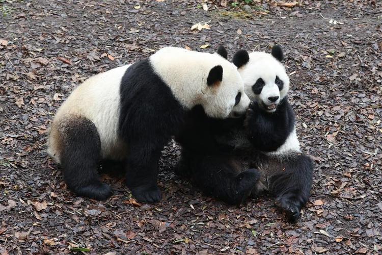 11月10日,在位于比利时布吕热莱特的天堂动物园,大熊猫“宝弟”(左)和“宝妹”在嬉戏。