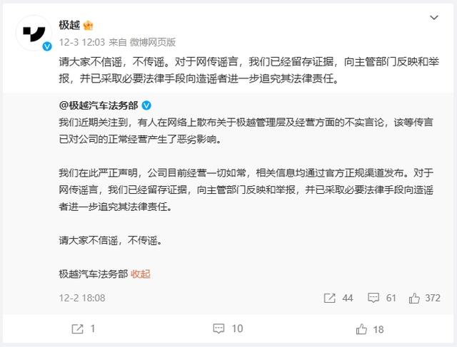 极越汽车的经营难关早有传闻。12月2日,有网友在社交媒体发文称,极越汽车已经开启大规模裁员,老员工不续签,且在年前裁员40%。随后,极越汽车法务部发布微博,称网络上散布的关于极越管理层及经营方面的言论不真实,公司当前的经营一切如常。