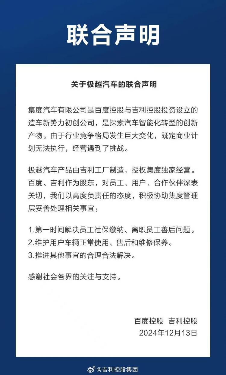 同时称,极越汽车产品由吉利工厂制造,授权集度独家经营。百度、吉利作为股东,对员工、用户、合作伙伴深表关切,以高度负责任的态度,积极协助集度管理层妥善处理相关事宜:第一时间解决员工社保缴纳、离职员工善后问题;维护用户车辆正常使用、售后和维修保养;推进其他事宜的合理合法解决。