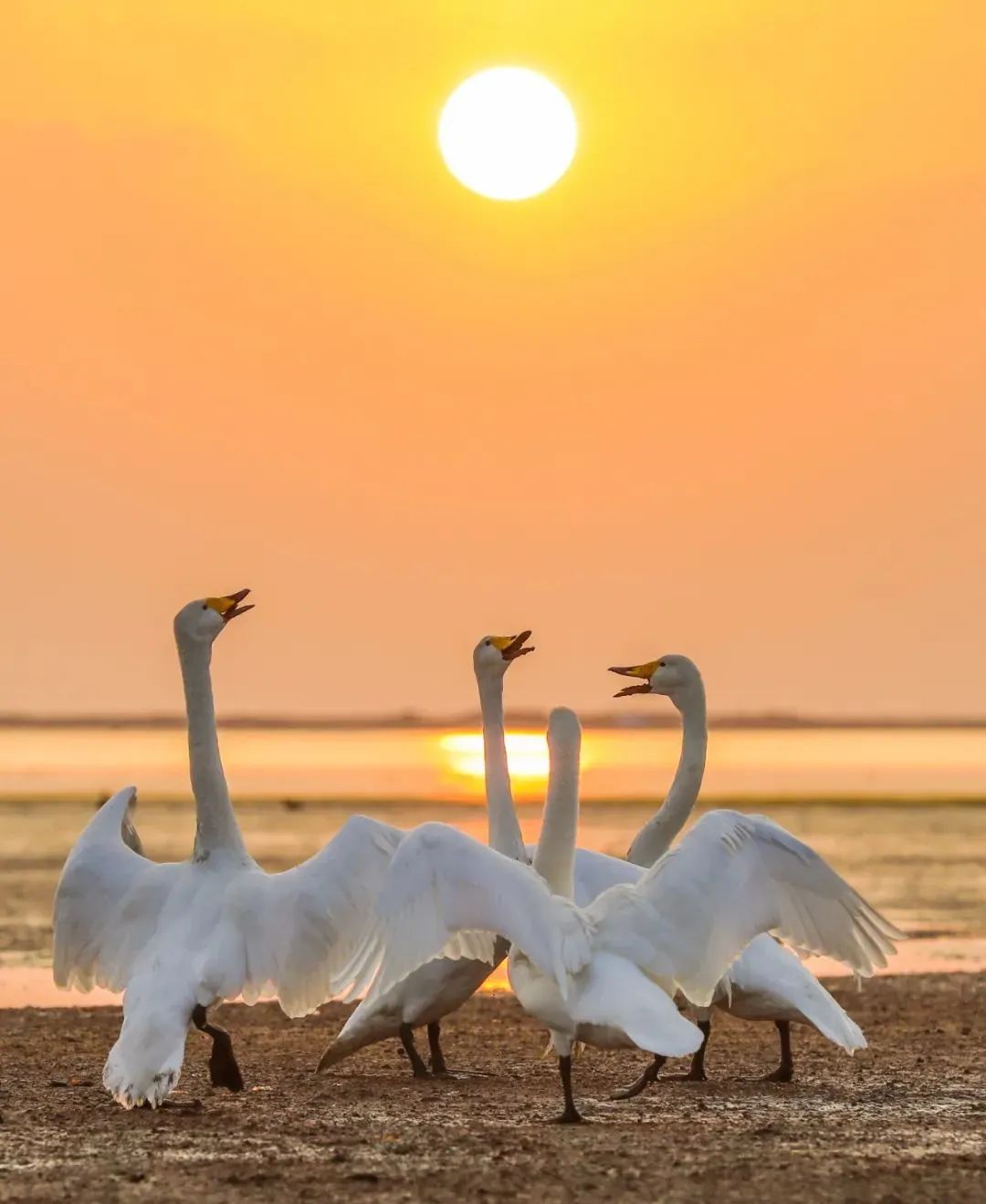 也许,你的寒意激活我睡意朦胧的细胞,寂美的雪中唤起我摄鹅寻诗,冬季雪国鹅缘,内心生命燃烧起升起的太阳,已超越沧桑情感。——威海大天鹅