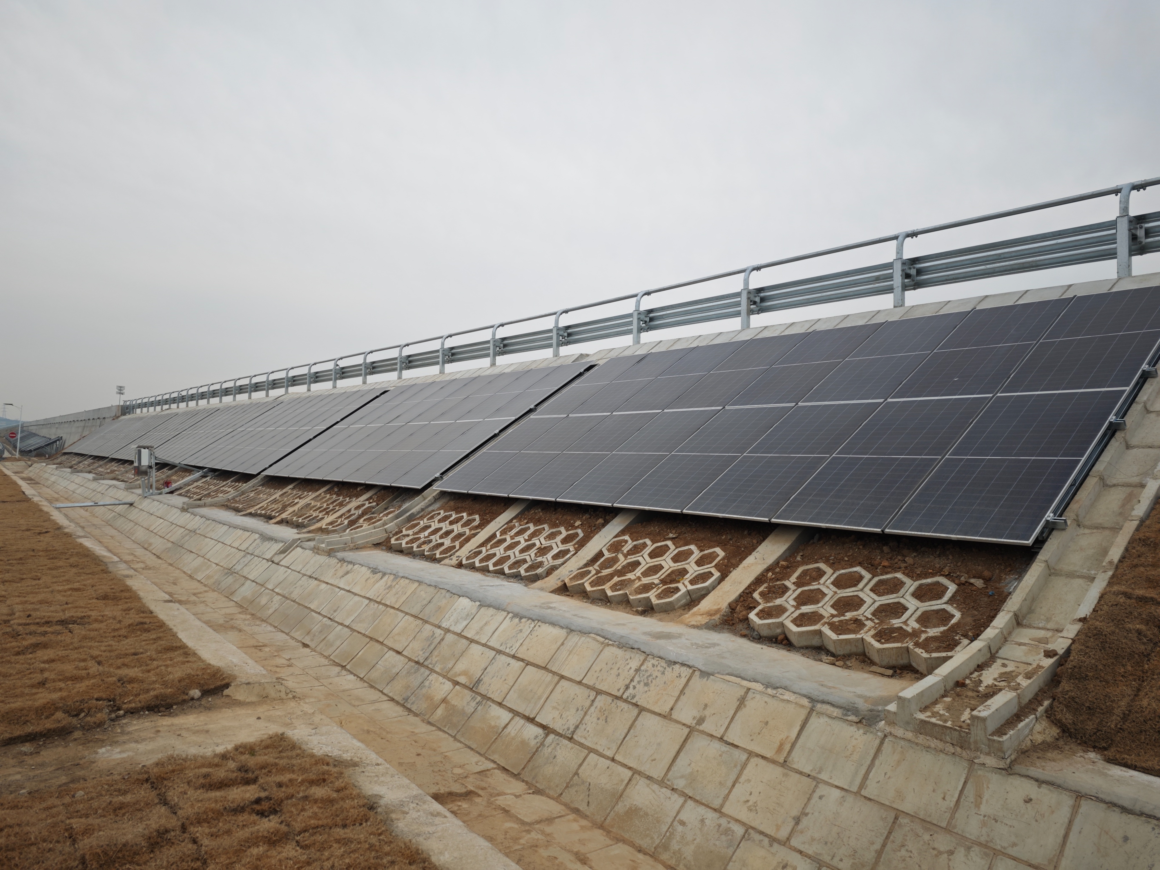 12月12日,在济菏高速长清服务区东区,高速公路与服务区匝道间的挡土墙处,光伏板整齐排布,按照经过测算效能最高的夹角紧密贴合于边坡上。停车位上安装有光伏车棚,光伏板能利用上下两面发电。