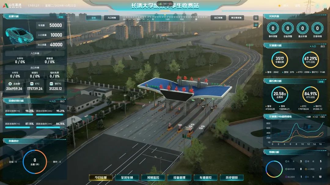进入平台长清大学城数字孪生收费站模块,收费站的实时状态以建模形式呈现在了画面上,仿佛一个“平行时空”。“管理者既能以视频监控般的宏观角度洞察整个收费站,也可以在一张图中直观地模拟车辆详情、交易记录以及设备运行状况,并进行数据分析和统计,从而为决策制定提供更为精确且详尽的信息支持。”山东高速集团济菏高速改扩建项目“济菏数智运营管理平台”工程技术人员王世海介绍。