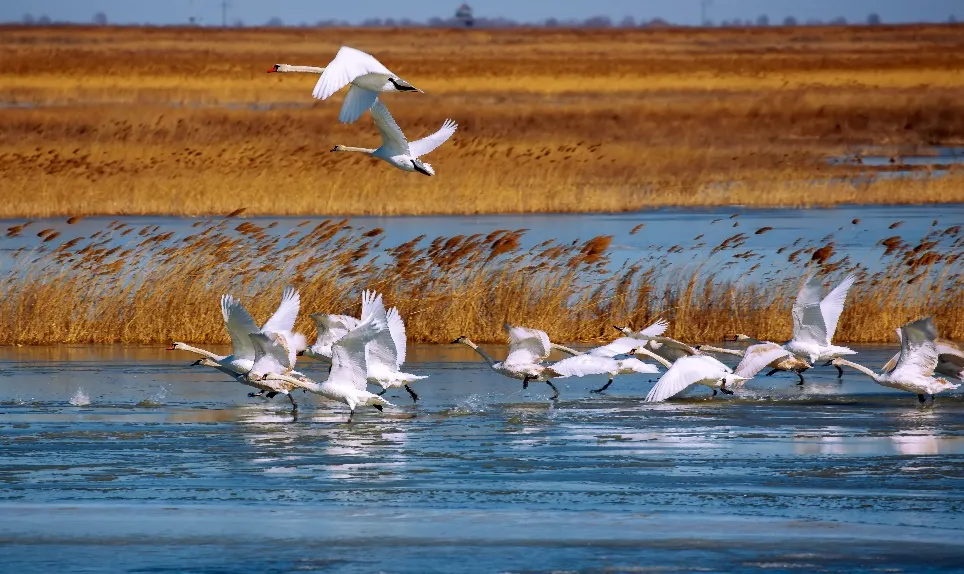 东八路观鸟线路:沿途以淡水沼泽湿地为主,可以观赏到赤膀鸭、红头潜鸭、灰雁、鸿雁、大天鹅、灰鹤等为主的涉禽及游禽。