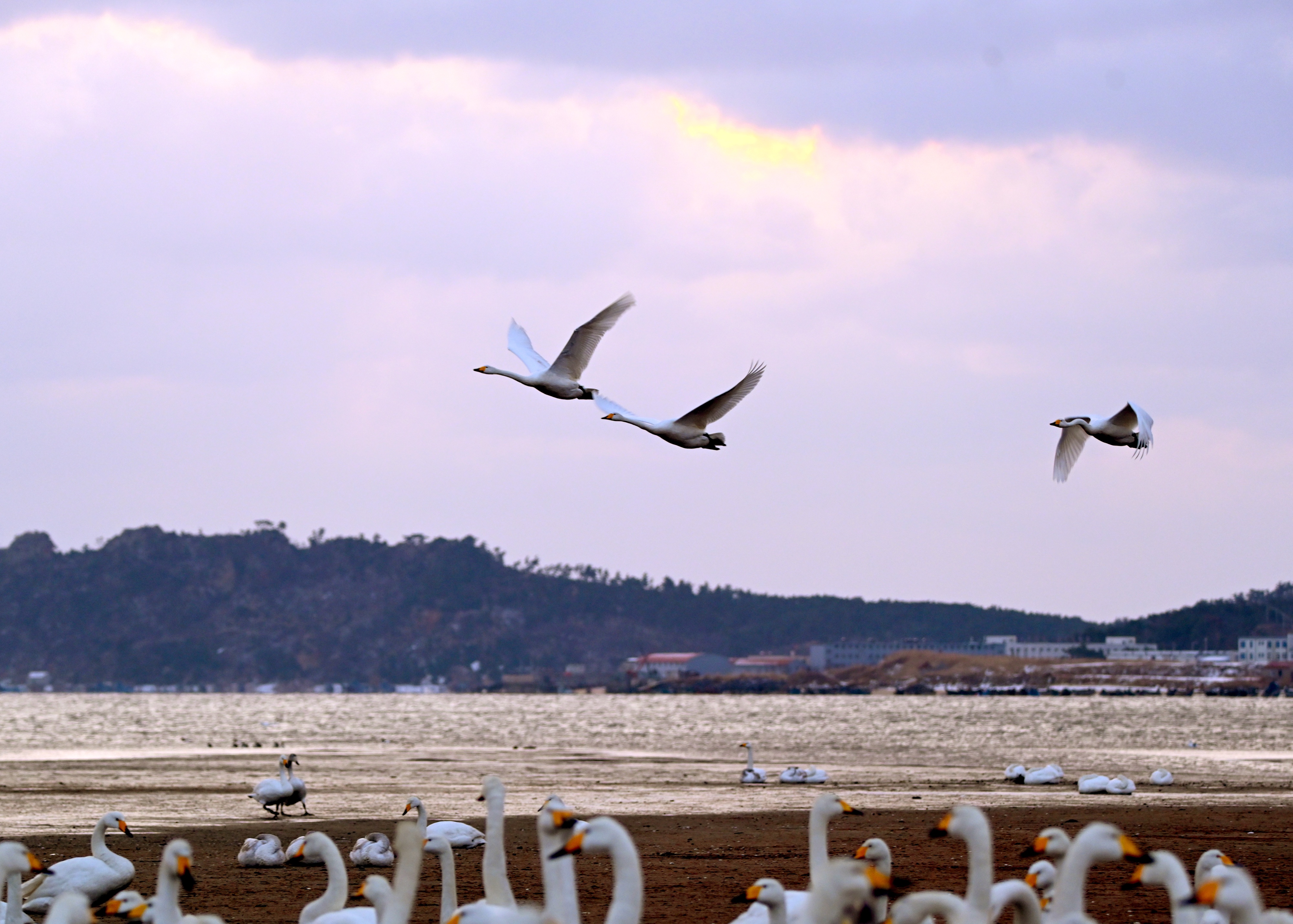 荣成是大天鹅在我国境内的主要越冬栖息地,每年自10月开始,上万只大天鹅从西伯利亚、蒙古飞越数千公里来到这里越冬,直至次年3月再陆续北迁。