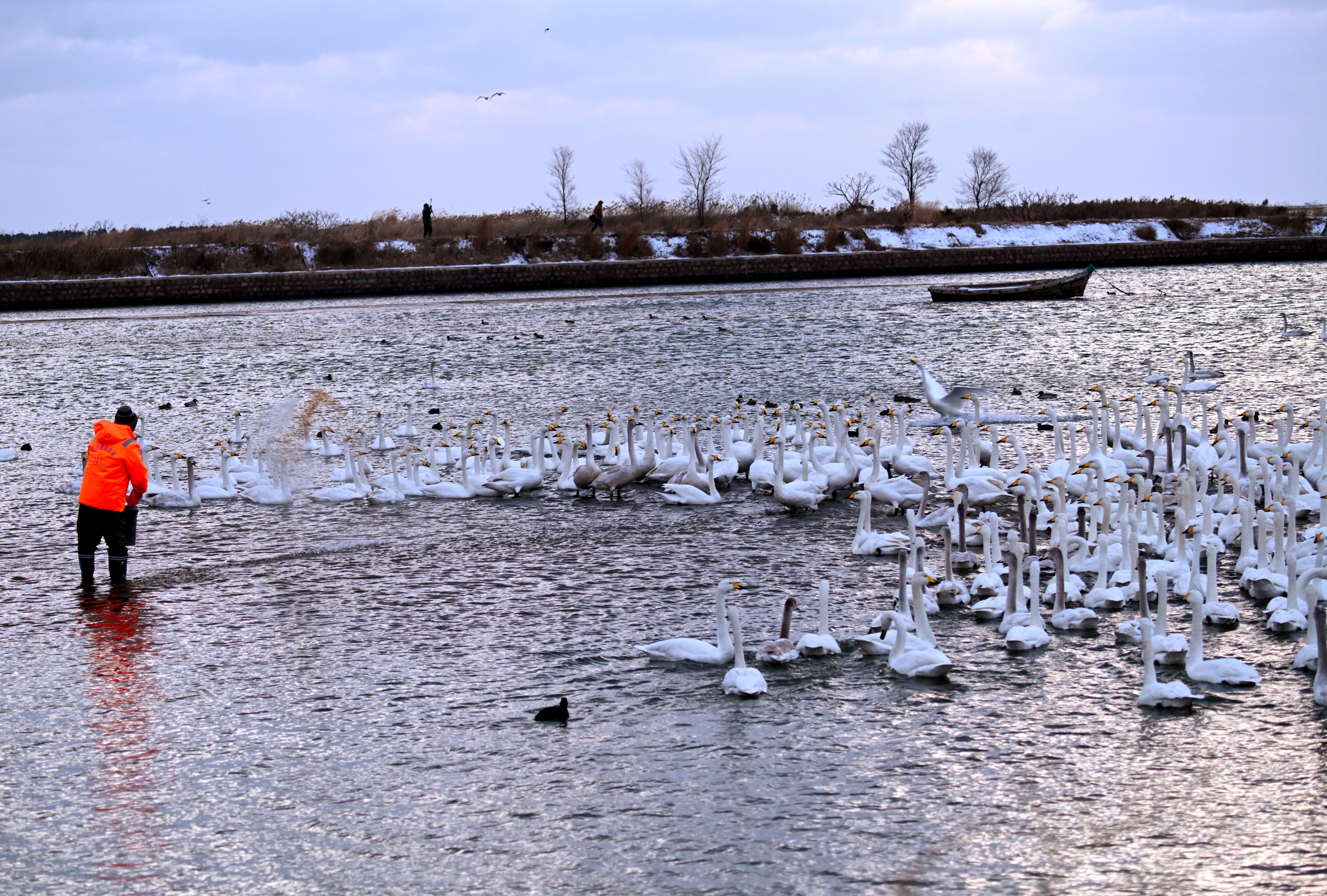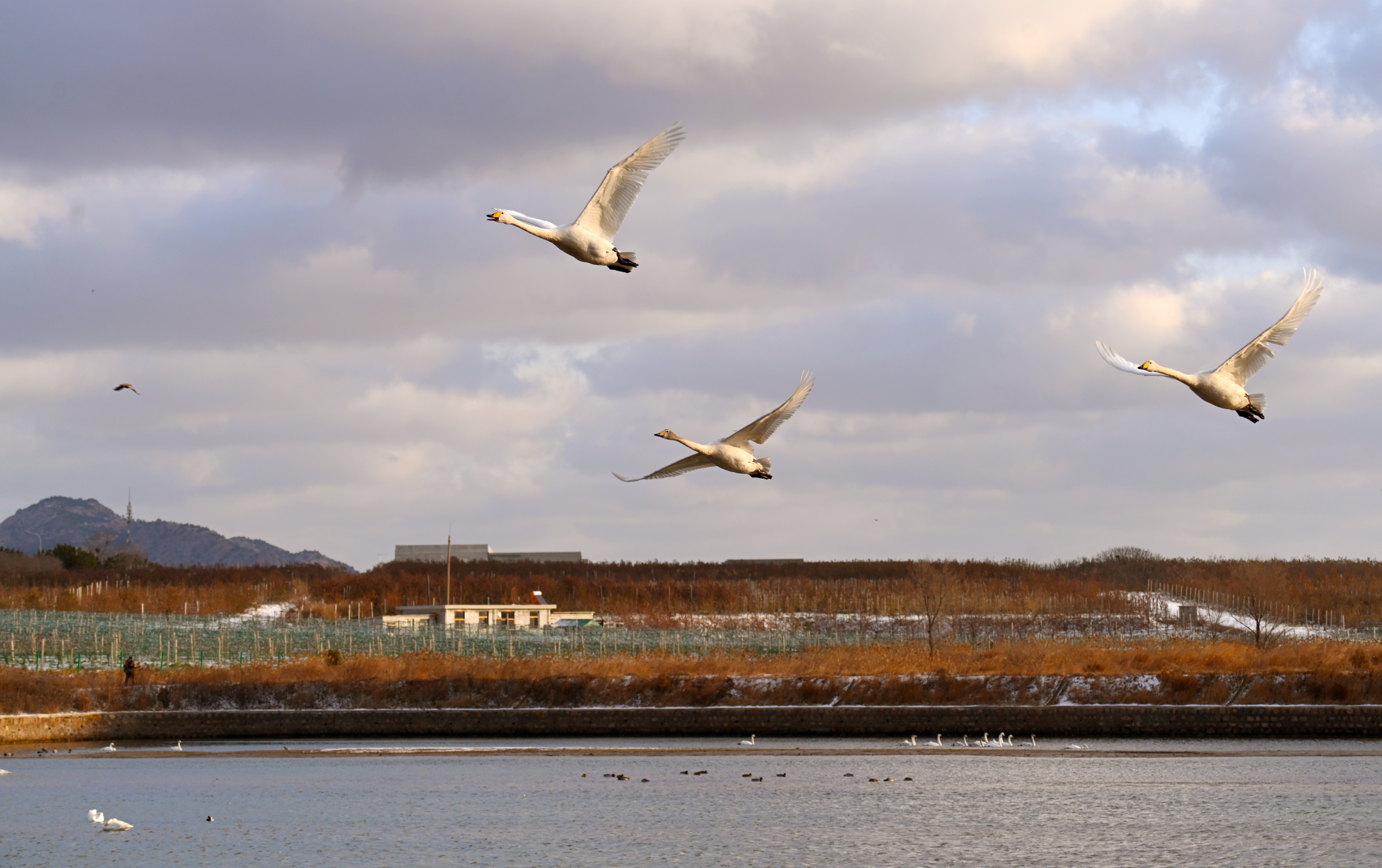 12月21日,在荣成市天鹅湖畔,成群的大天鹅或在湖面栖息,或者天空飞舞。