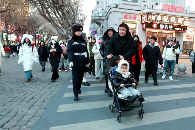 隋欣在中央大街路口执勤。新华社发“游客和网友的关注是认可,也是激励。”隋欣说,看着家乡这么热闹,感觉很自豪。业余时间,自己会做更多功课,给游客提供游玩攻略,让他们不虚此行。