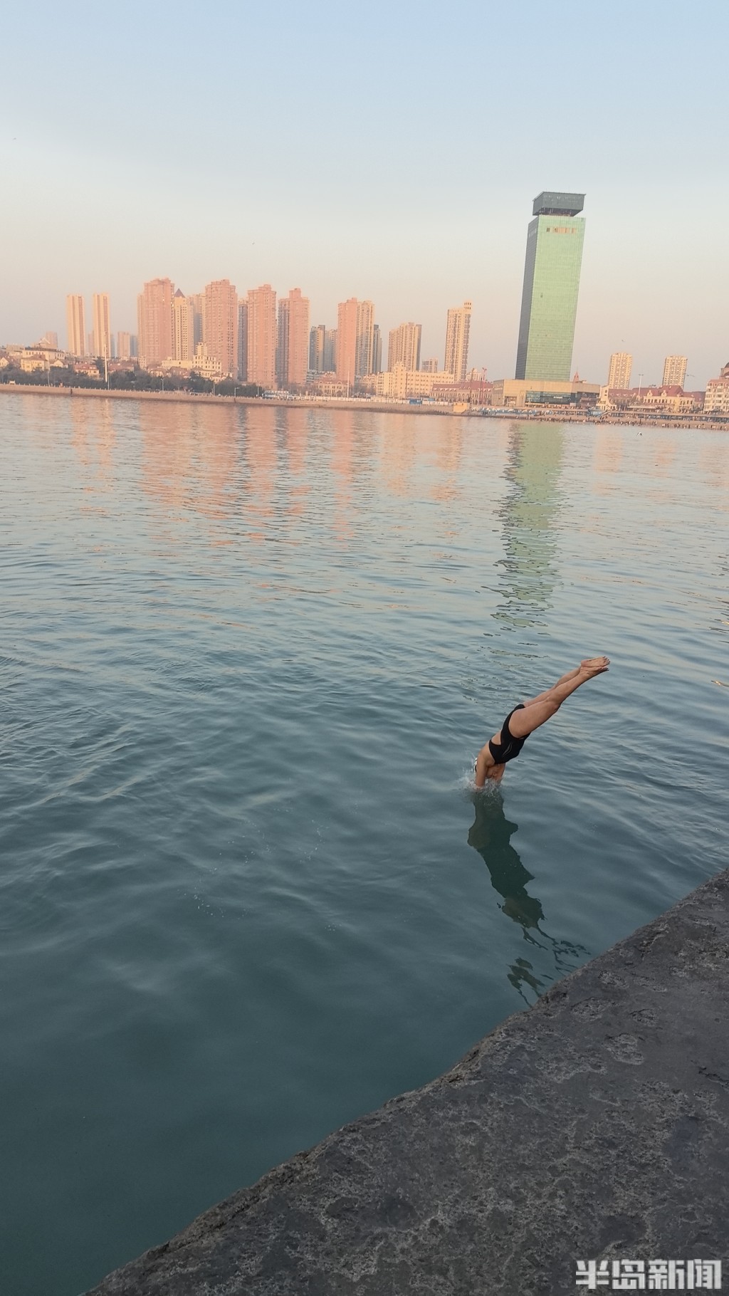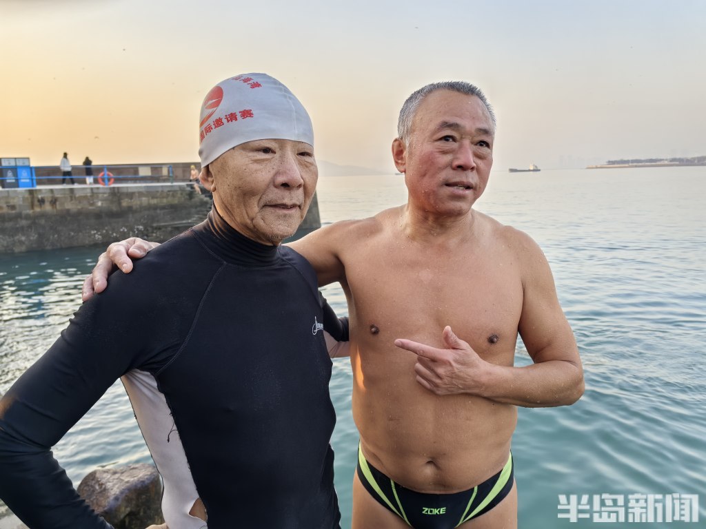 因为当天天气寒冷,冬泳爱好者们先进行了长时间的热身,66岁的邓宗平在简单热身之后就下水游泳,随后其他游泳爱好者陆续到来,只见他们穿着各种颜色和款式的泳衣,排成一队走到高台上,随后用各种各样的姿势跳入水中,附近的游客目光纷纷被吸引。由于天气寒冷,几位老人都跳了没多长时间就穿上了运动服准备跑步。据邓宗平介绍,他坚持冬泳和跳水已经二十多年了:“今天是1月1日,我们用这种方式迎接新年已经坚持十几年了,新年新气象,也是为了有个好的期望。我们好几个发小从小就在这附近玩,在这边跳水,总有种怀旧的感觉,也是为了更好的有个身体,助力全民健身。”