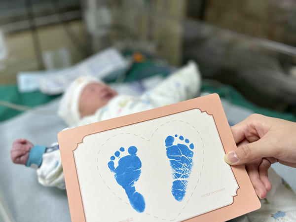 在中国福利会国际和平妇幼保健院诞下的首个元旦宝宝,留下的蓝色小足印。