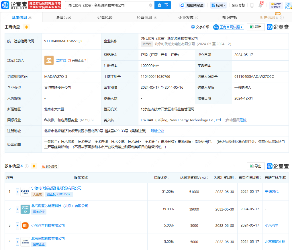 企查查信息显示,该公司成立于2024年5月,法定代表人为孟祥峰,注册资本10亿人民币,由宁德时代、北汽海蓝芯能源科技(北京)有限公司、小米汽车科技有限公司、北京京能科技有限公司共同持股。