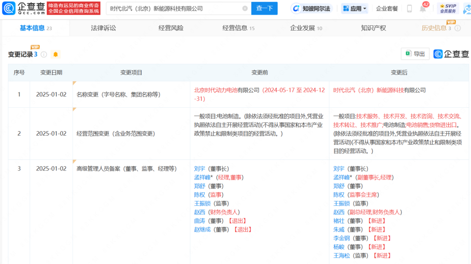 企查查APP显示,近日,北京时代动力电池有限公司发生工商变更,企业名称变更为时代北汽(北京)新能源科技有限公司,经营范围新增技术服务、技术开发、技术咨询、技术交流、技术转让、技术推广,电池销售,货物进出口,同时,部分主要人员也发生变更。