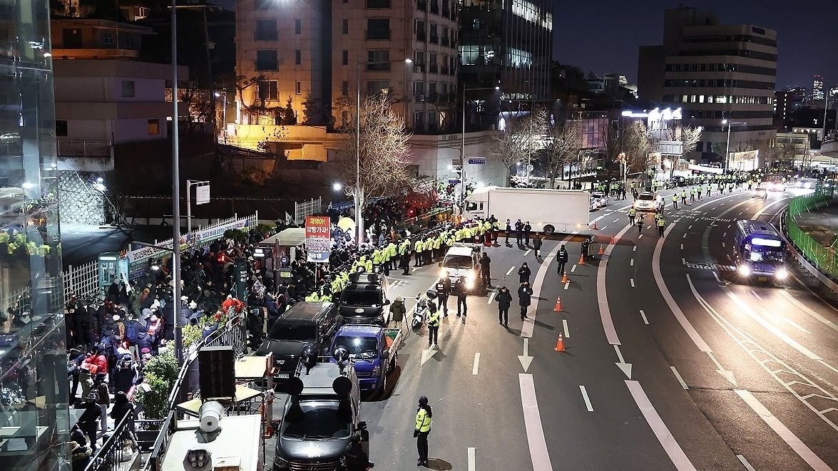 公调处调查官当天凌晨从政府果川办公大楼分乘5辆车出发,前往总统官邸执行逮捕令。公调处调查官抵达官邸后遭遇尹锡悦支持者和总统警卫处的阻拦,一度未能进入。(央视新闻)