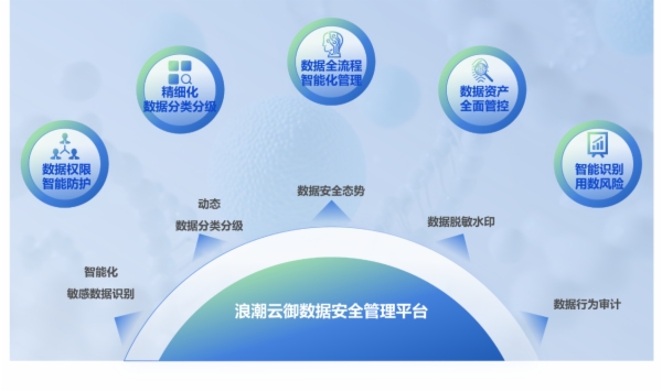 浪潮云御数据安全管理平台依托海若安全大模型,聚焦数据安全合规,实现了数据安全与数据业务场景深度融合的智能感知与处置,为各行业用户提供智能化敏感数据识别、动态数据分类分级、数据脱敏水印、数据行为审计、数据安全态势等能力,为用户带来数据全流程智能化安全管理、数据权限智能防护、精细化数据分类分级、数据资产全面管控以及用数风险智能识别等价值。目前,平台已应用于政务、教育、医疗、金融等众多领域并获得了行业用户的广泛好评。在当前数据要素时代,浪潮云御数据安全管理平台已将各项数据安全能力原子化融入至浪潮云行业大模型及可信数据空间等核心业务,在模型数据训练、模型内容输出、数据流通利用以及数据商品开发等场景中实现数据风险的可管、可控、可见、可防。
