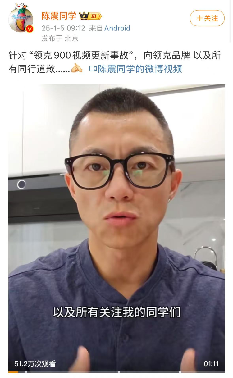 1月5日,知名汽车博主陈震发文称,针对“领克900视频更新事故”,向领克品牌以及所有同行道歉。