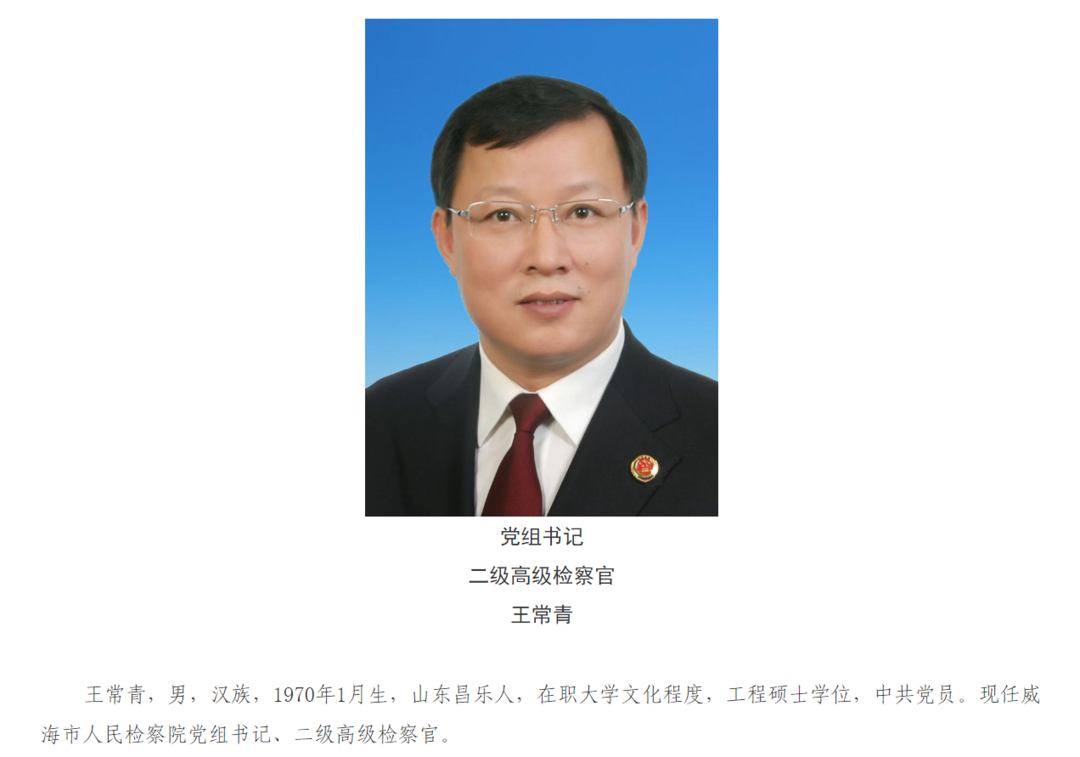 1月3日,威海市人民检察院网站更新现任领导信息,王常青已任威海市人民检察院党组书记。2024年12月20日,中共山东省委组织部发布干部任前公示公告:王常青,男,汉族,1970年1月生,在职大学,工程硕士,中共党员。现任潍坊市检察院党组副书记、副检察长、二级高级检察官,拟任副厅级领导职务。