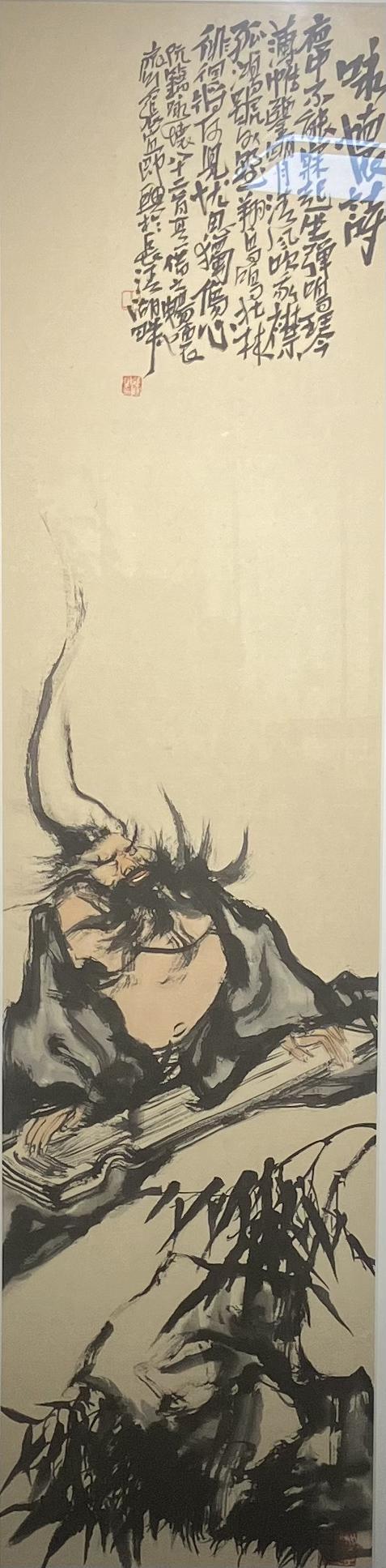 如果说闭着的眼睛,体现的是忧虑,寂寞,悲凉的情感,那么上挑的眉毛,炸开的虬髯,以及冲天的头发,则体现了一种愤懑。诗人的情感是复杂的,多层次的,而面部表情和毛发的张扬,呈现出一种巨大的反差,凸显了他内心矛盾而痛苦的一面。怒发冲冠,是愤怒到极点的表现,但诗人偏偏紧闭双眼,这种张力,蕴含着巨大的能量。毛发冲天,是一种夸张,但却是一种写意的夸张。这种隐藏的力量,是每一个看画的人,都能体会到的。