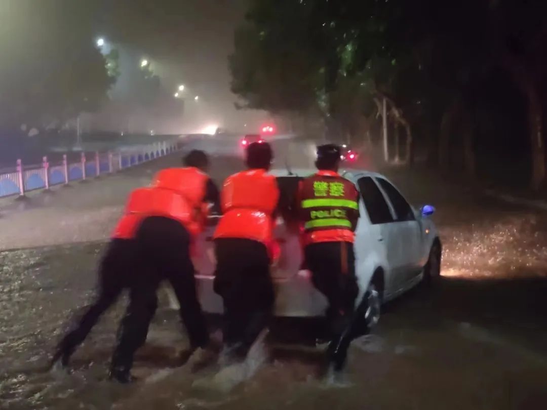 ▲ 2022年6月,五莲县公安局特巡警队员在暴雨中救助抛锚车辆。