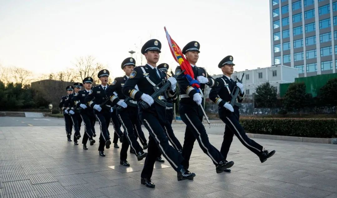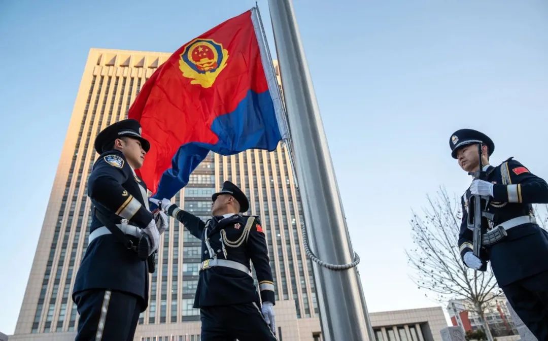 上午7时30分,仪仗队员迈着铿锵步伐,护卫中国人民警察警旗行进至旗杆前。伴随着嘹亮的《中国人民警察警歌》,警旗冉冉升起,全体民警向警旗庄严敬礼,表达对党和人民的绝对忠诚,对公安事业的无限热爱。警旗下,全体民警振臂握拳,慷慨激昂地进行了公安机关人民警察誓词宣誓。