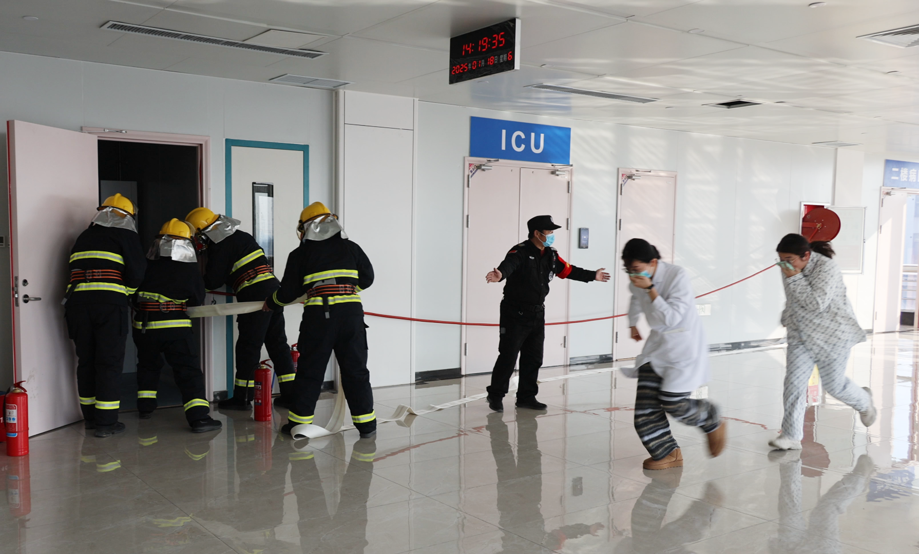 在消防应急演练环节,参演人员模拟了警情报告、人员疏散转移、初期火灾扑救等场景;在消防处置环节,演练了灾情侦察、人员搜救、外部控火、举高救人、供水供气等科目。整个演练过程紧张有序,参演人员配合默契,充分展示了东营市卫生健康系统干部职工的消防应急处置能力。