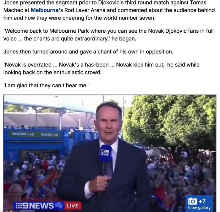 在德约科维奇与赛会26号种子托马斯-马哈奇的比赛之前,这位澳大利亚主持人向观众介绍起赛前球迷助阵的画面,并发表了不合时宜的评论。