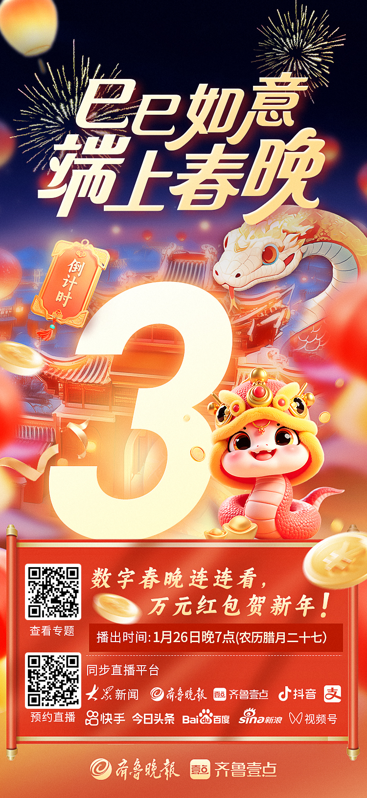 看节目,抢红包,新技术,新体验!2025“端上春晚”将会是一场数字春晚、文化春晚,也是一场科技春晚、百姓春晚,更是一场备受瞩目的“线上大联欢”,还在等什么?腊月二十七日晚7点,锁定齐鲁壹点,万元红包陪您红红火火过新年!
