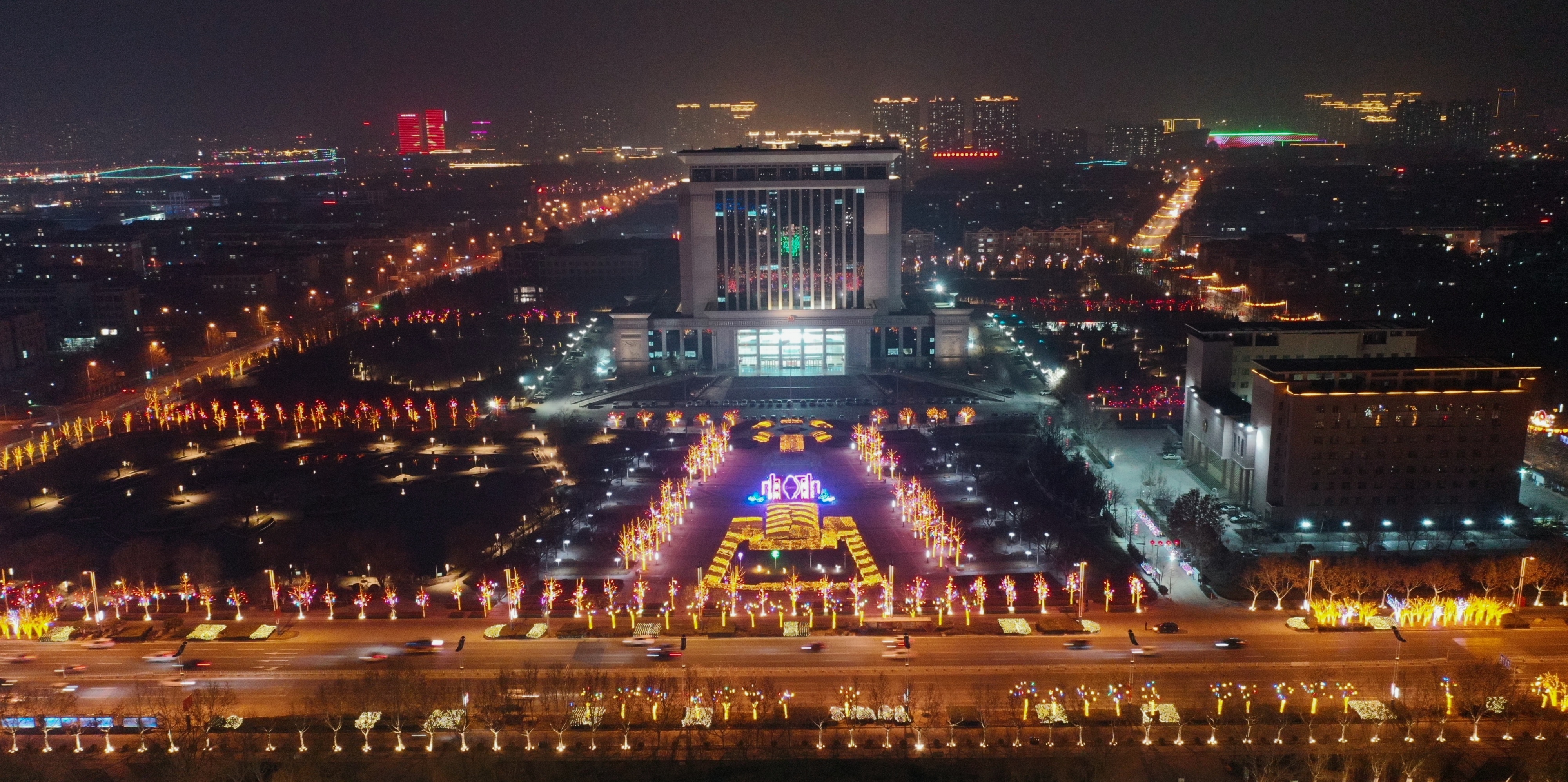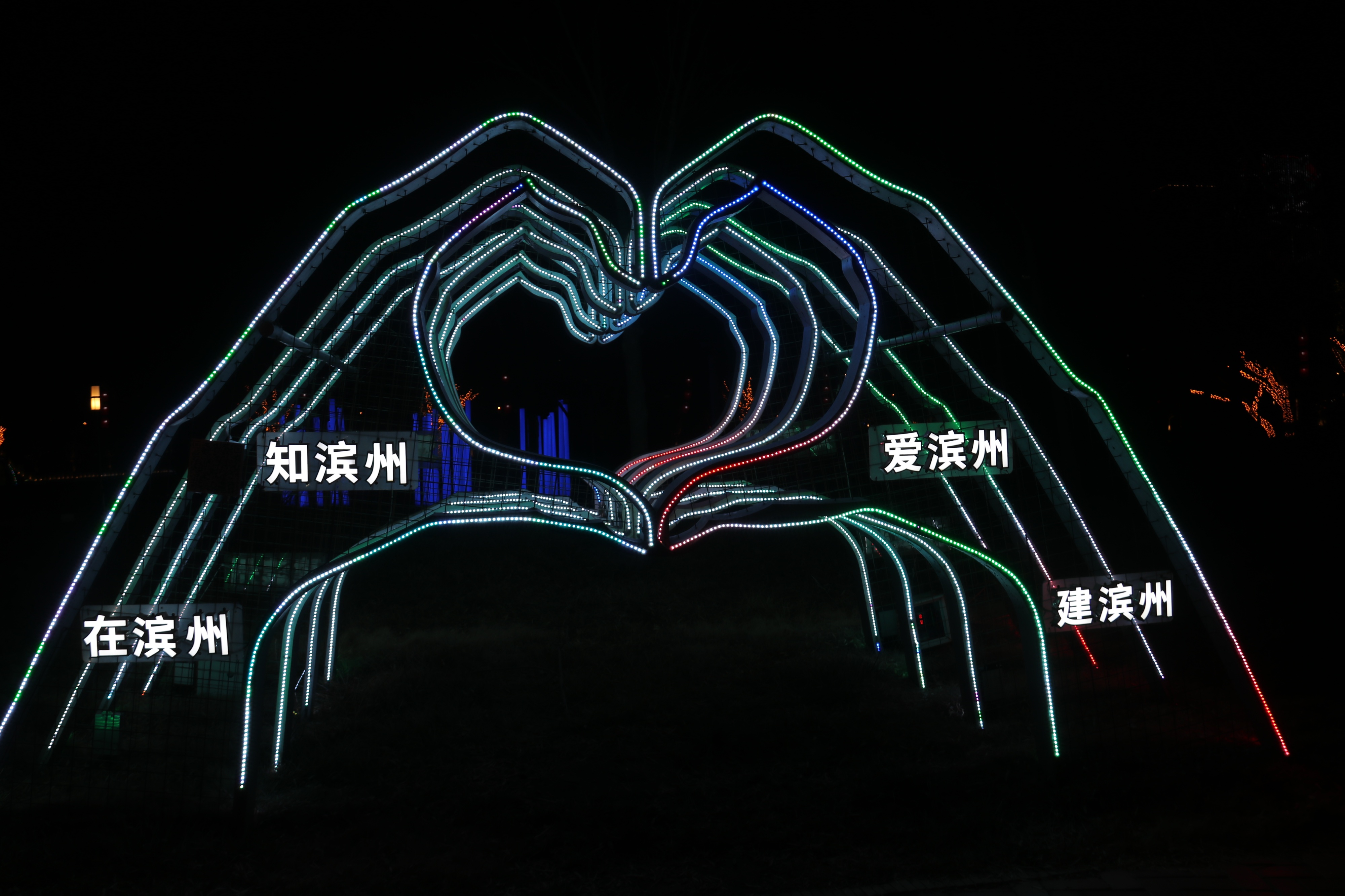 整个市区亮化设计造型美观、颜色靓丽、霓虹闪烁、相互映衬,“彩衣”绚烂,千姿百态的彩灯将市区的夜晚装扮得格外亮丽,滨州独具特色的节日亮化夜景,让整座城市处处洋溢着浓浓的年味儿。