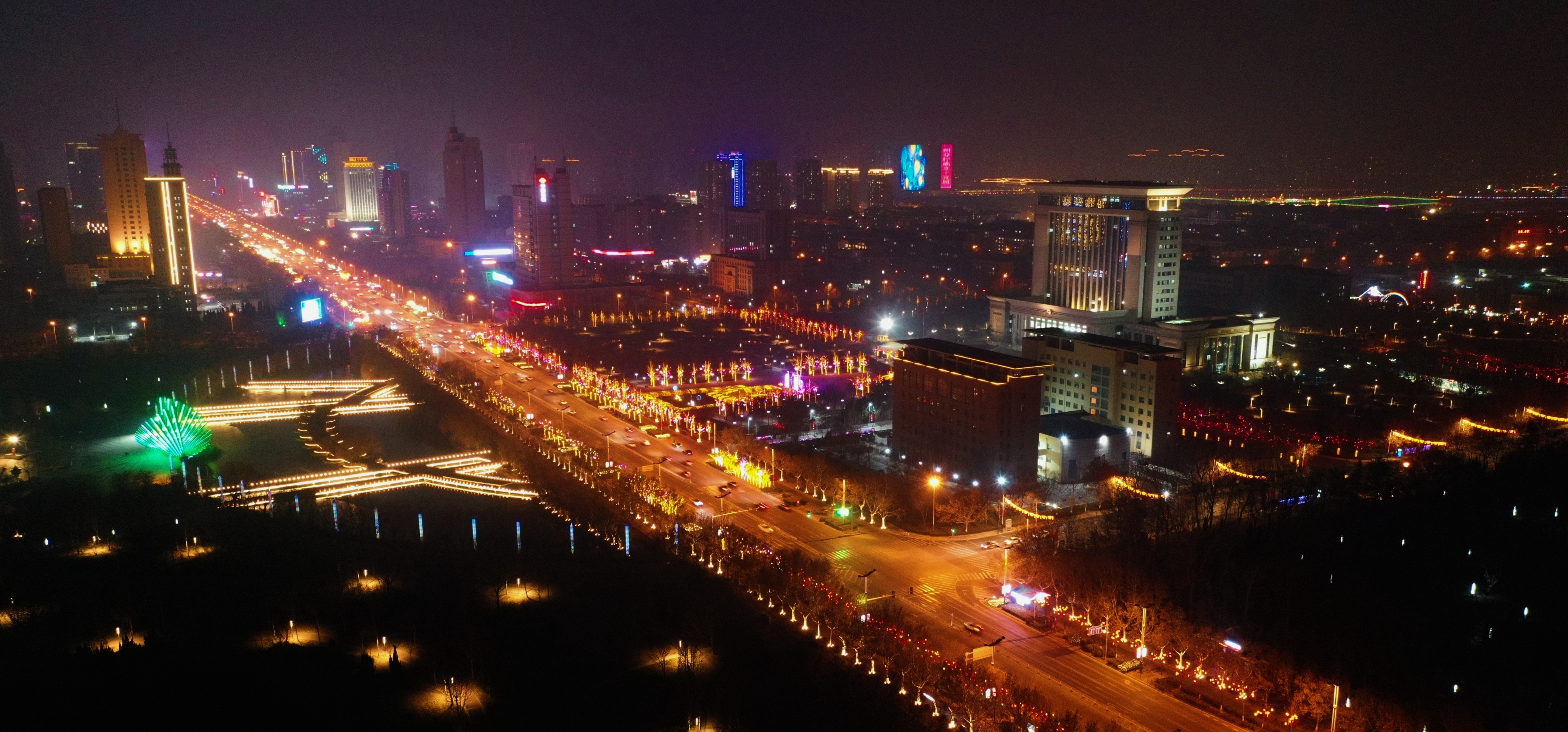 “线”上精细整合。在黄河二路、黄河五路、渤海十八路等18条主要路段两旁树干上,缠绕多色灯串,悬挂红灯笼、中国结、雪花灯、彩色立体福袋、流星雨条形灯、动感星球灯等挂件灯饰,突出“静态为主”向“动静结合”转变,当夜幕降临,这些灯饰或闪烁、或流动,交相辉映,真正打造出了流光溢彩、璀璨夺目的城市夜景。