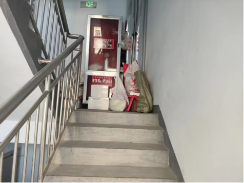 1、楼梯间堆放杂物,遮挡室内消火栓。